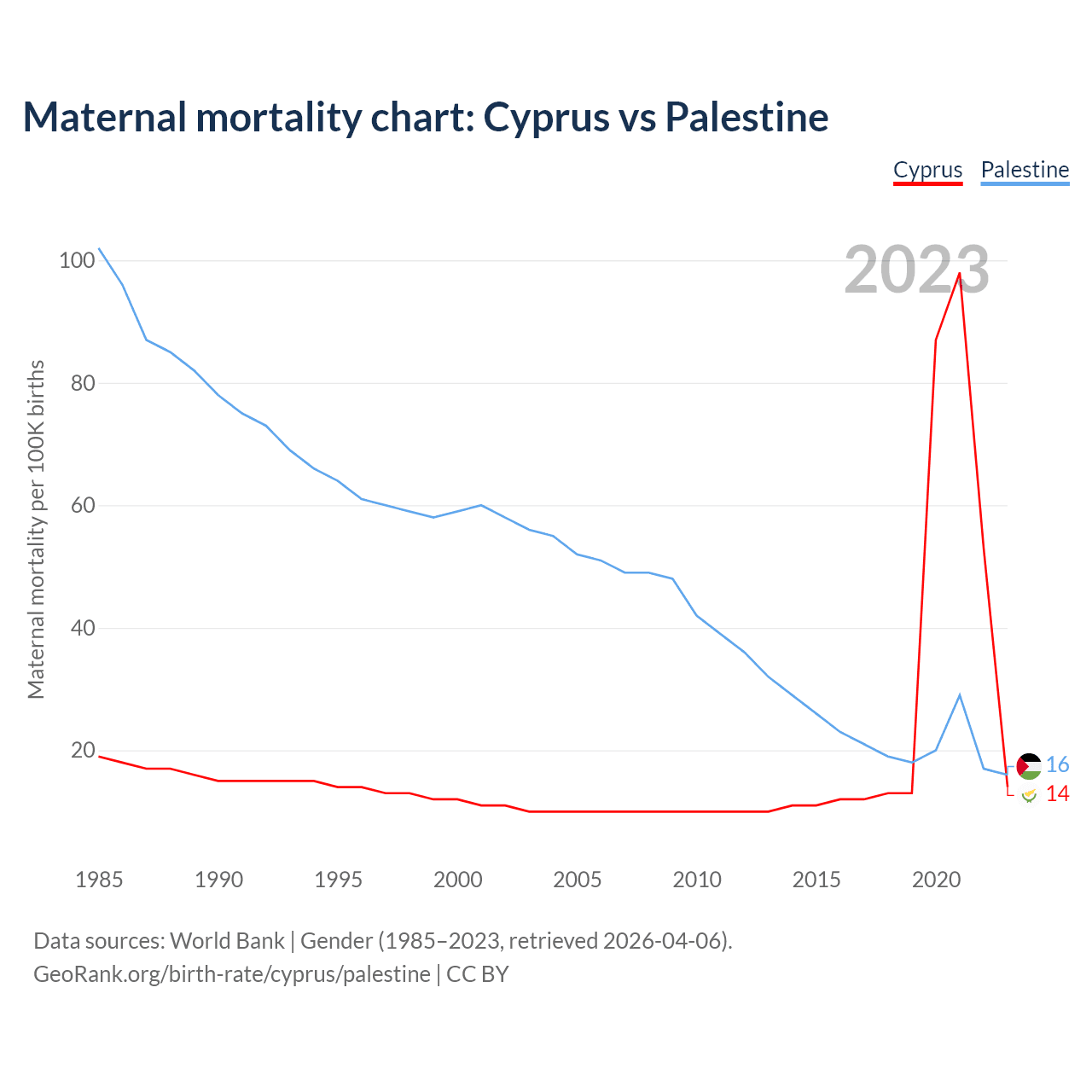 The maternal mortality rate, which is the probability of dying during childbirth or within 42 days of pregnancy termination, is 14 deaths per 100,000 live births in Cyprus, compared to 16 deaths in Palestine.
