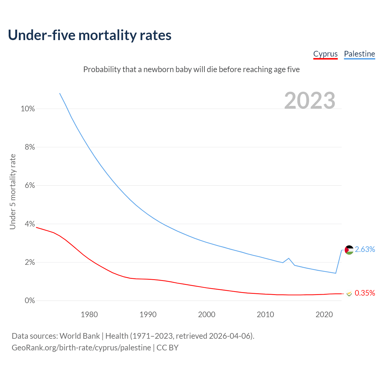 The chance that a newborn baby will die before reaching age five is 0.35% in Cyprus and 2.63% in Palestine. Above is a chart with historical data on under-five mortality rates.