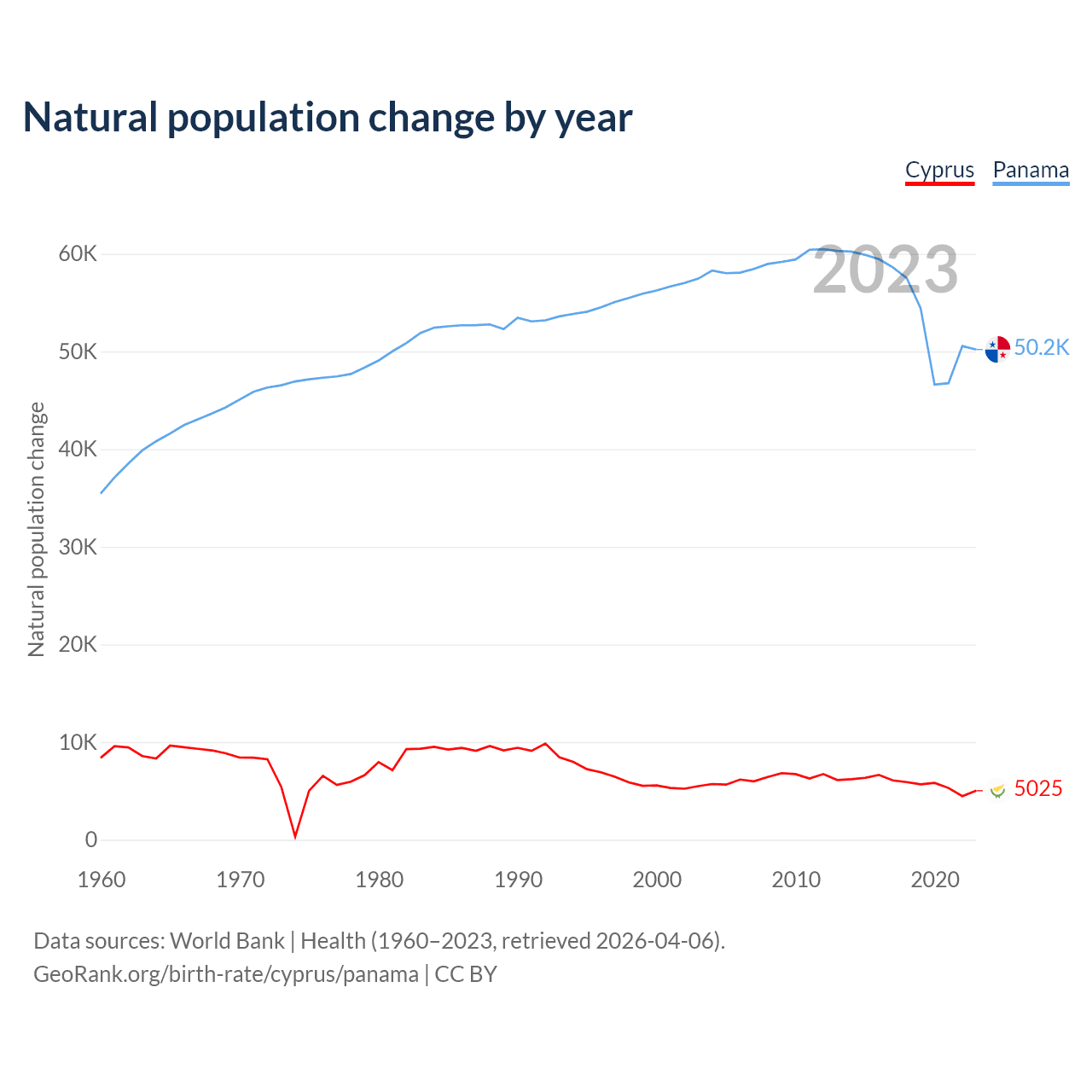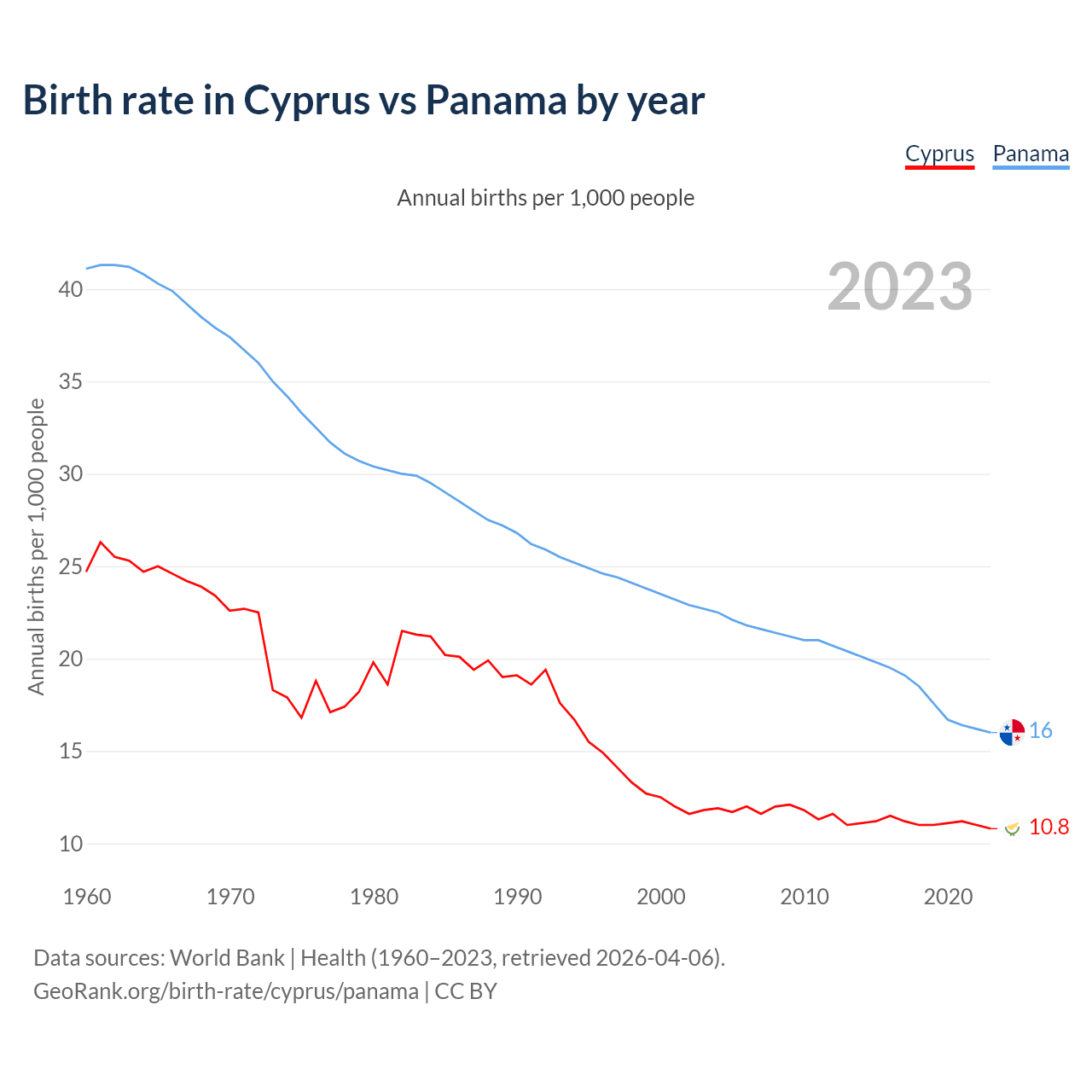 Cyprus has an annual birth rate of 10.8 births per 1,000 people, compared to 16 for Panama. The average number of children a woman is expected to have during her lifetime — the fertility rate, is 1.39 in Cyprus and 2.12 in Panama — 52.6% difference.