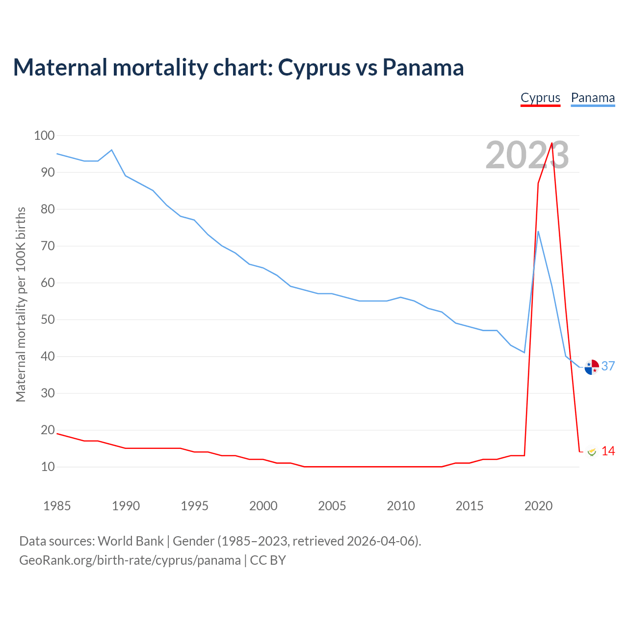 The maternal mortality rate, which is the probability of dying during childbirth or within 42 days of pregnancy termination, is 14 deaths per 100,000 live births in Cyprus, compared to 37 deaths in Panama.