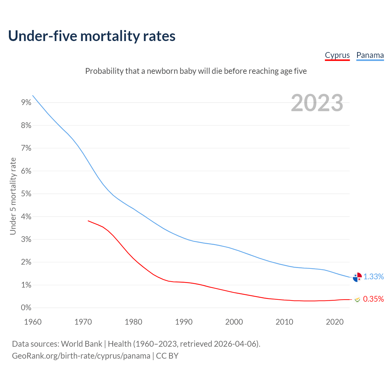 The chance that a newborn baby will die before reaching age five is 0.35% in Cyprus and 1.33% in Panama. Above is a chart with historical data on under-five mortality rates.