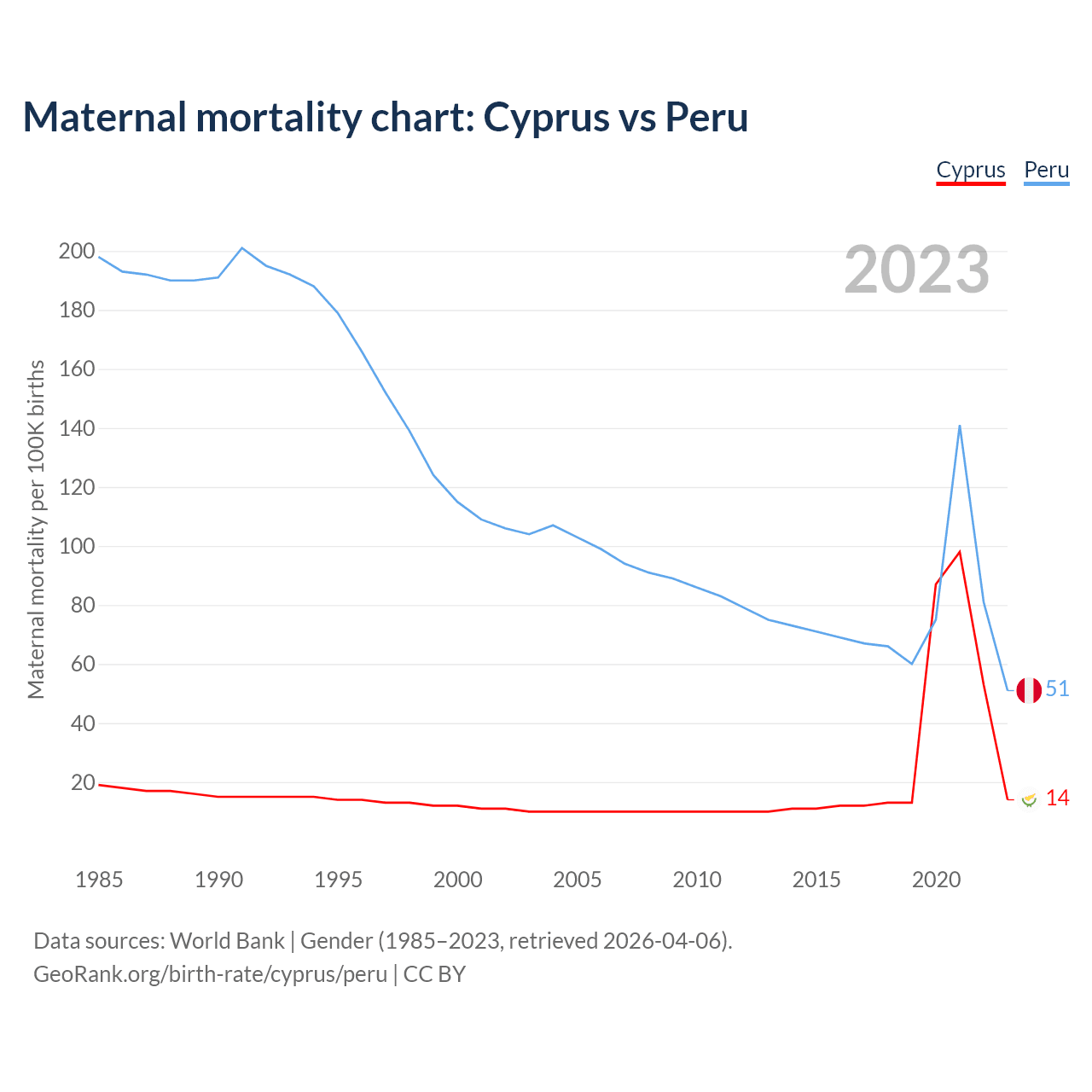 The maternal mortality rate, which is the probability of dying during childbirth or within 42 days of pregnancy termination, is 14 deaths per 100,000 live births in Cyprus, compared to 51 deaths in Peru.