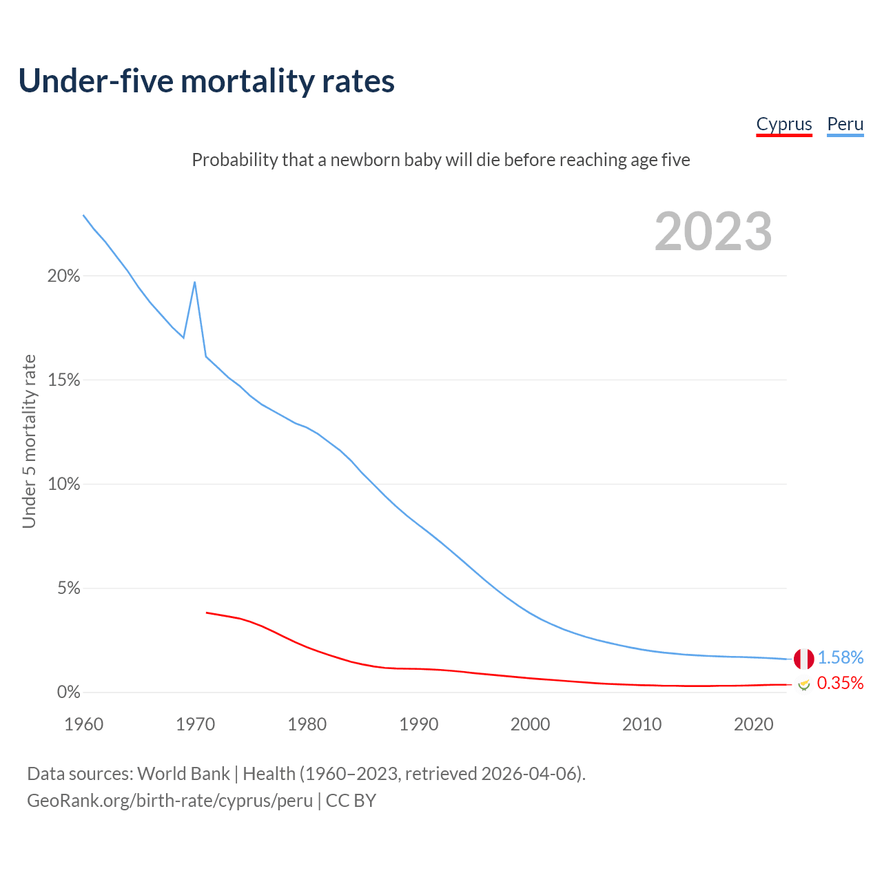 The chance that a newborn baby will die before reaching age five is 0.35% in Cyprus and 1.58% in Peru. Above is a chart with historical data on under-five mortality rates.