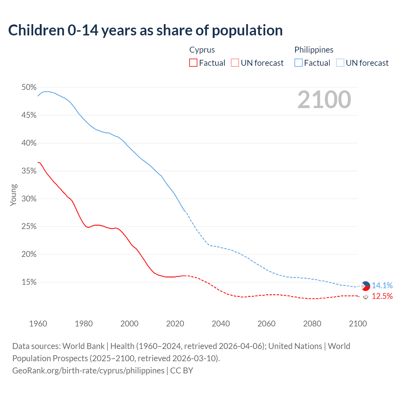 According to the latest available data on birth rates, the fertility rate in Cyprus was 1.39 children per woman in 2023, compared to 1.92 in the Philippines in 2023. The replacement level is considered to be 2.1 children per woman.