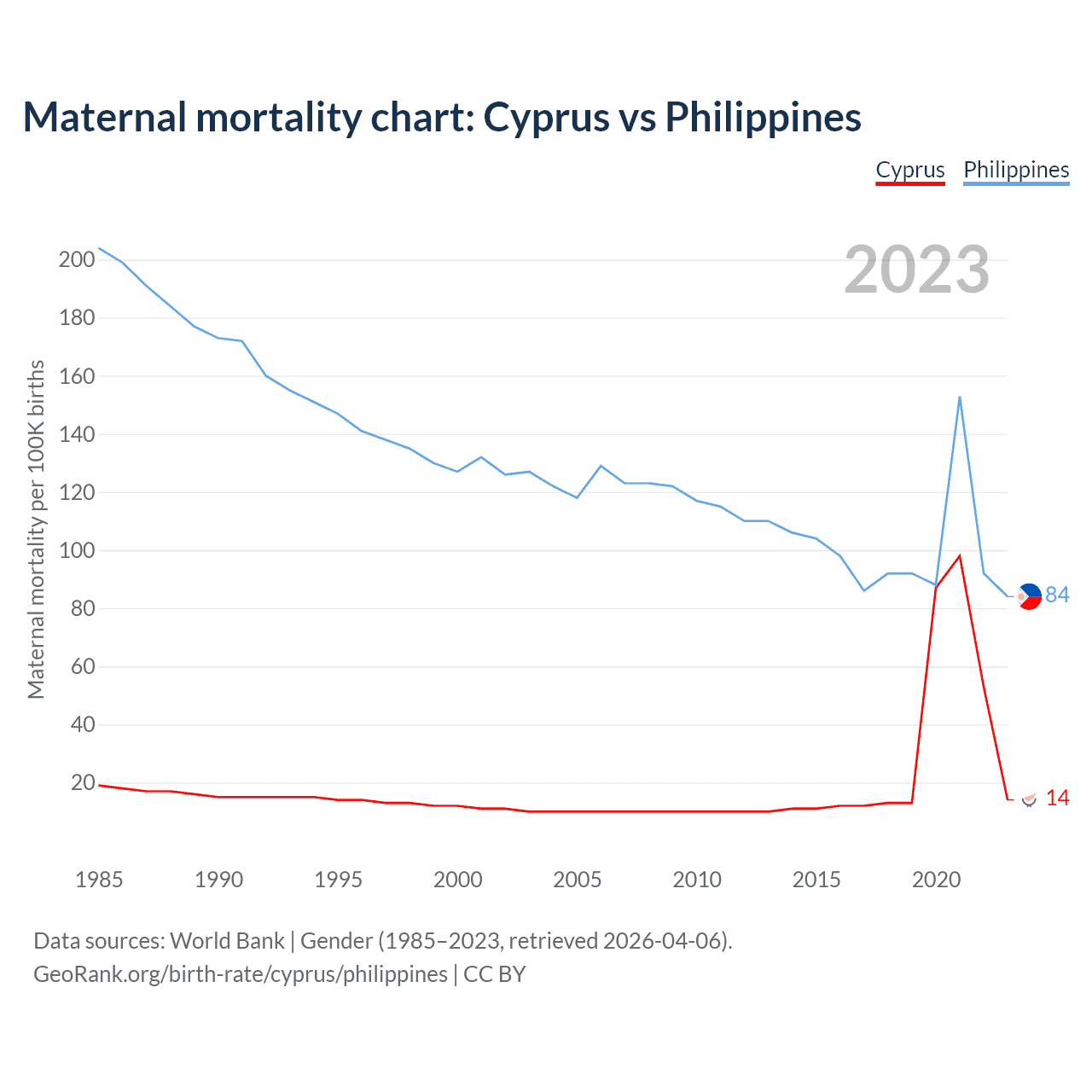 The maternal mortality rate, which is the probability of dying during childbirth or within 42 days of pregnancy termination, is 14 deaths per 100,000 live births in Cyprus, compared to 84 deaths in the Philippines.