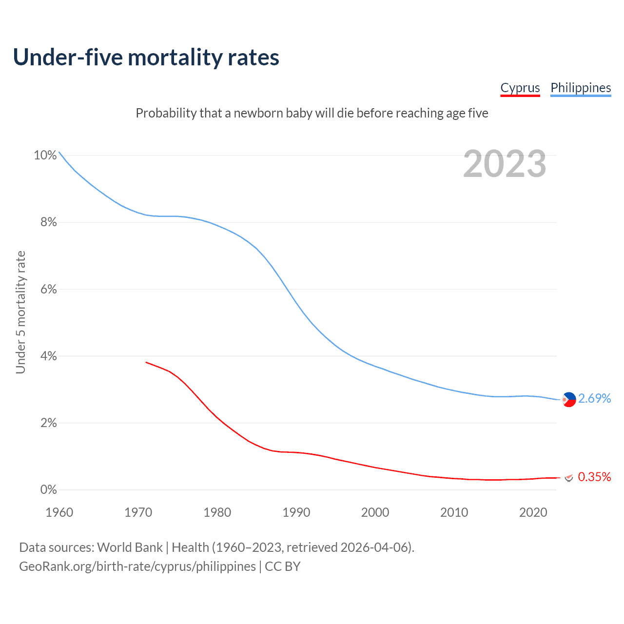 The chance that a newborn baby will die before reaching age five is 0.35% in Cyprus and 2.69% in the Philippines. Above is a chart with historical data on under-five mortality rates.