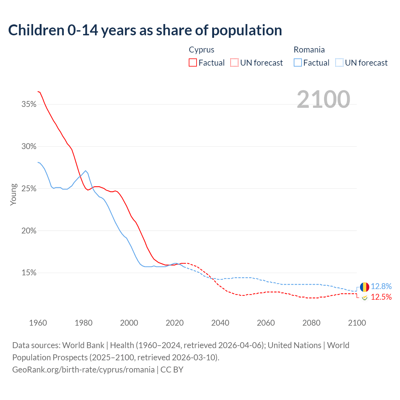 According to the latest available data on birth rates, the fertility rate in Cyprus was 1.39 children per woman in 2023, compared to 1.71 in Romania in 2023. The replacement level is considered to be 2.1 children per woman.