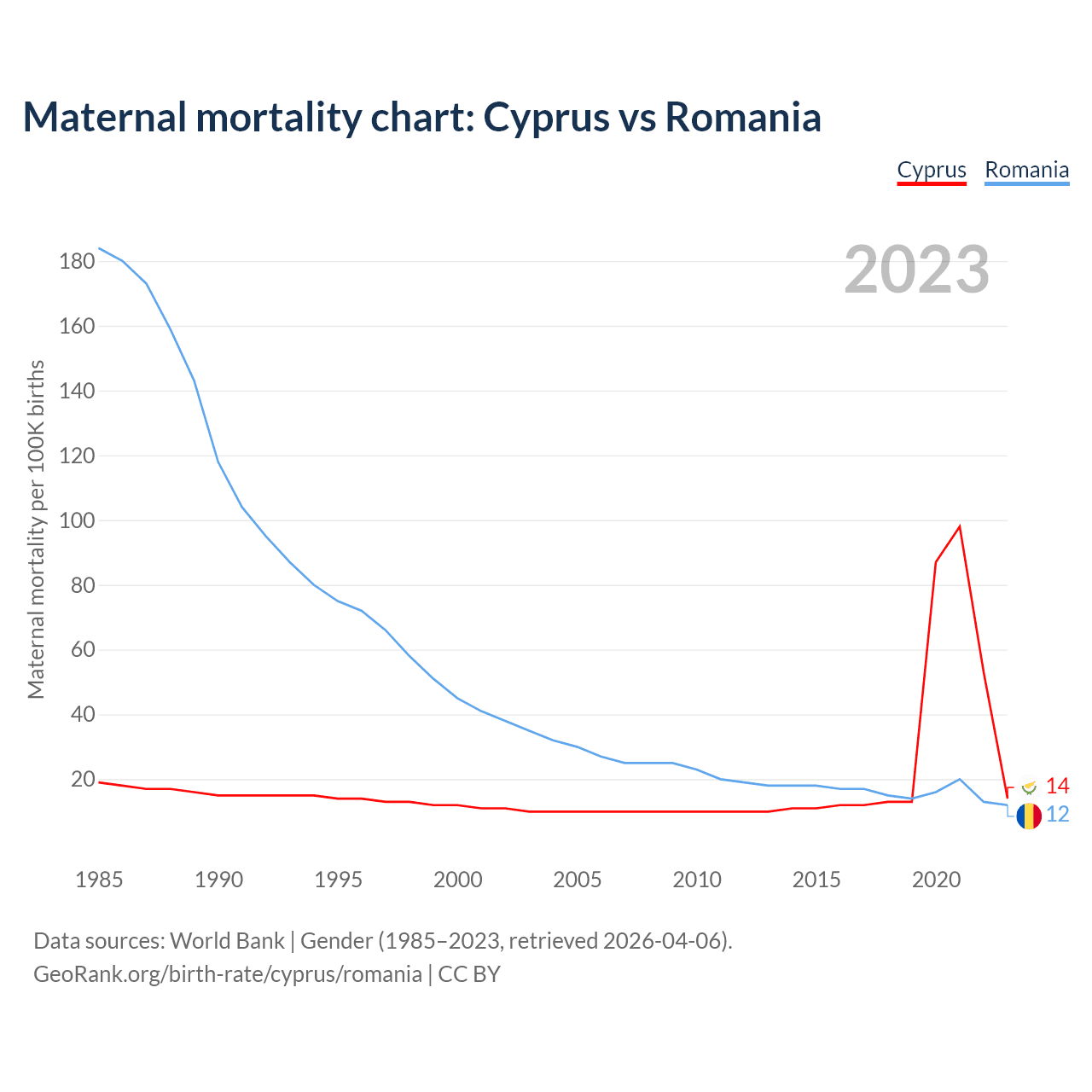 The maternal mortality rate, which is the probability of dying during childbirth or within 42 days of pregnancy termination, is 14 deaths per 100,000 live births in Cyprus, compared to 12 deaths in Romania.