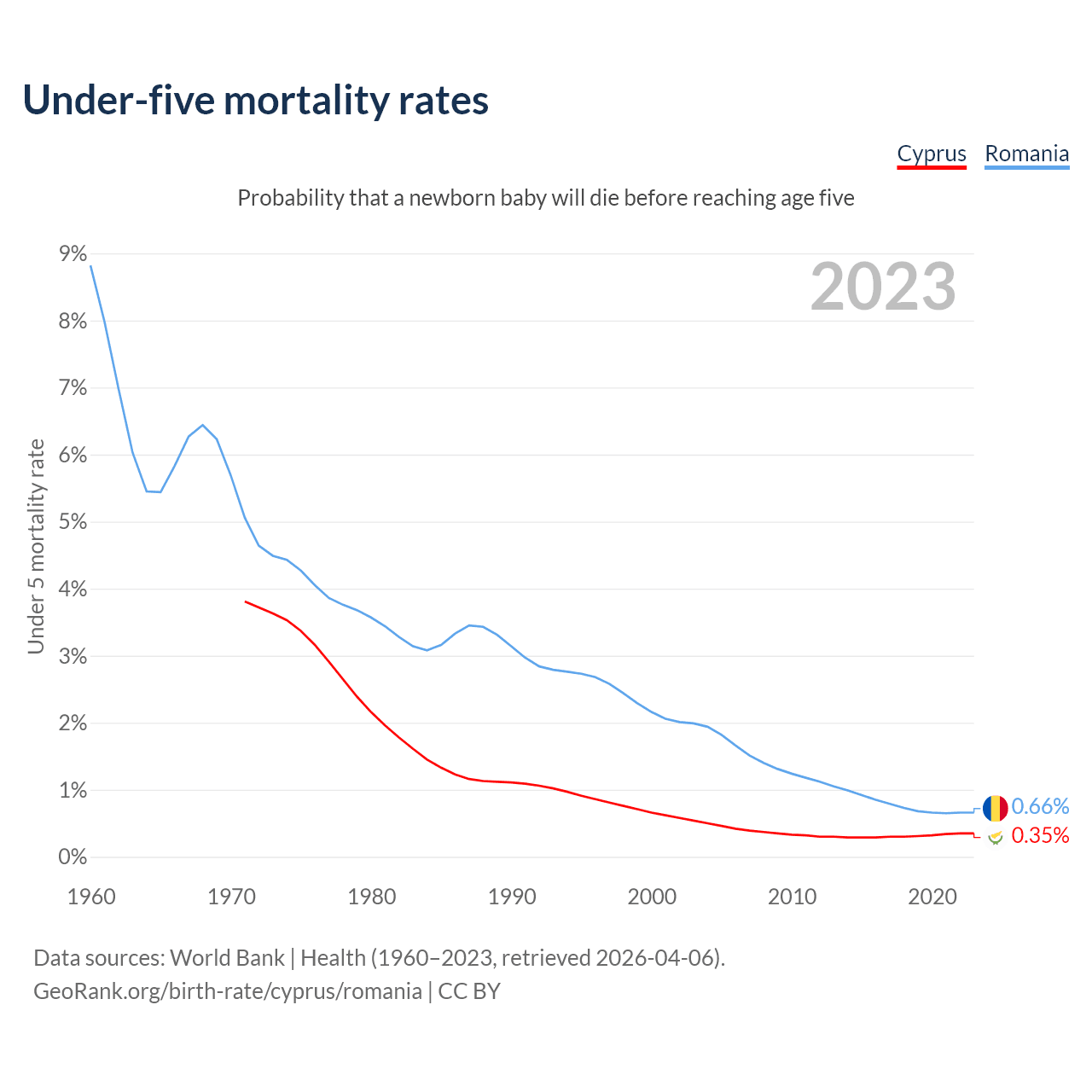 The chance that a newborn baby will die before reaching age five is 0.35% in Cyprus and 0.66% in Romania. Above is a chart with historical data on under-five mortality rates.