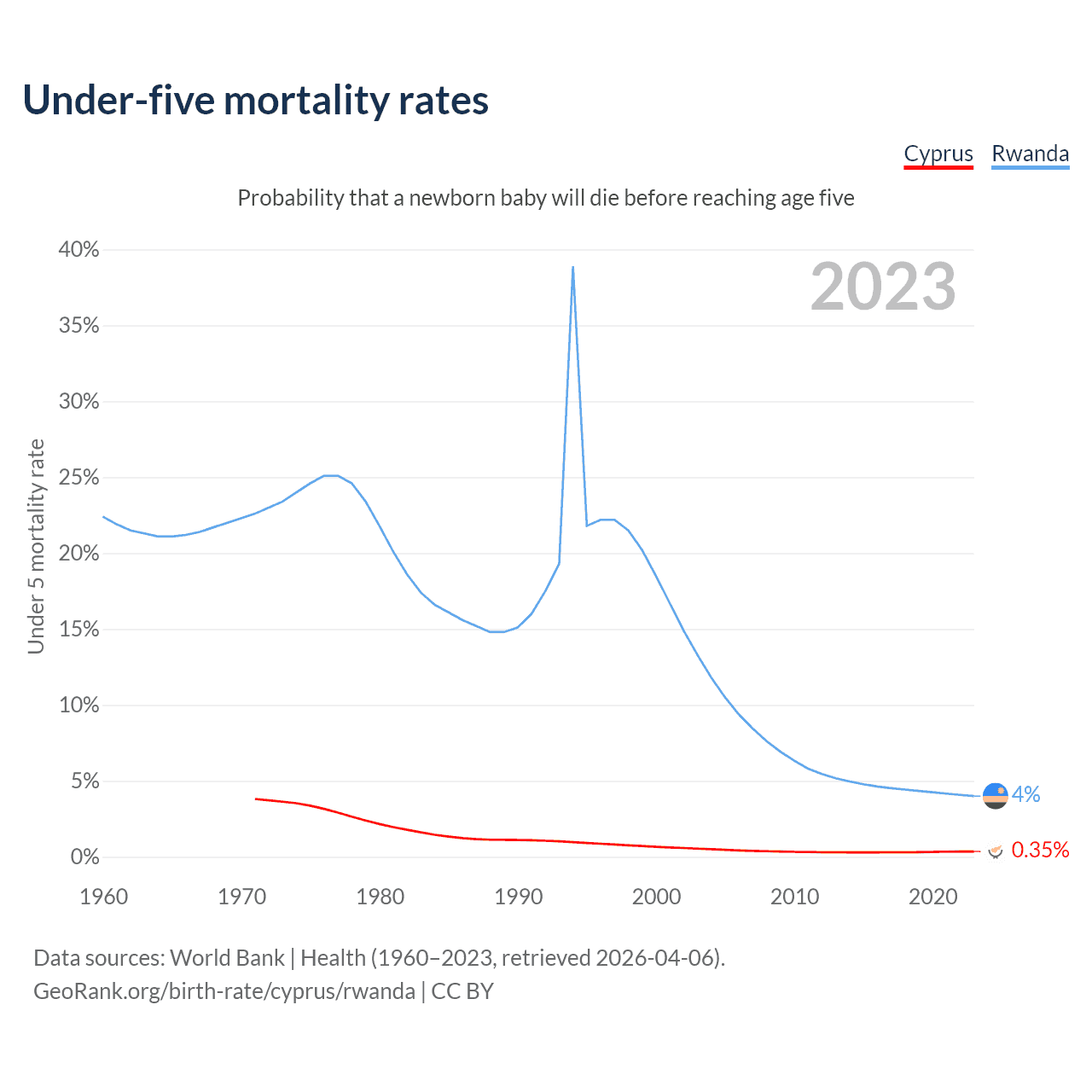The chance that a newborn baby will die before reaching age five is 0.35% in Cyprus and 4% in Rwanda. Above is a chart with historical data on under-five mortality rates.