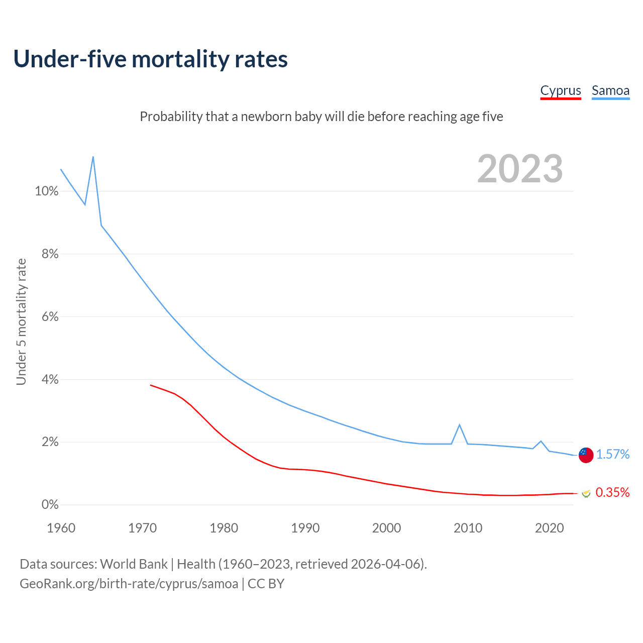 The chance that a newborn baby will die before reaching age five is 0.35% in Cyprus and 1.57% in Samoa. Above is a chart with historical data on under-five mortality rates.