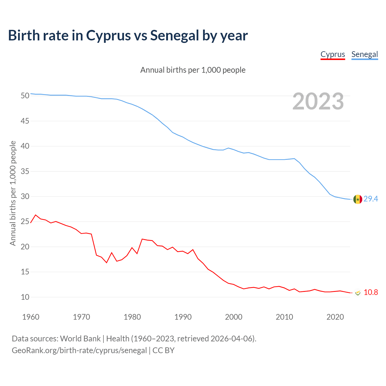 Cyprus has an annual birth rate of 10.8 births per 1,000 people, compared to 29.4 for Senegal. The average number of children a woman is expected to have during her lifetime — the fertility rate, is 1.39 in Cyprus and 3.82 in Senegal — 174.9% difference.