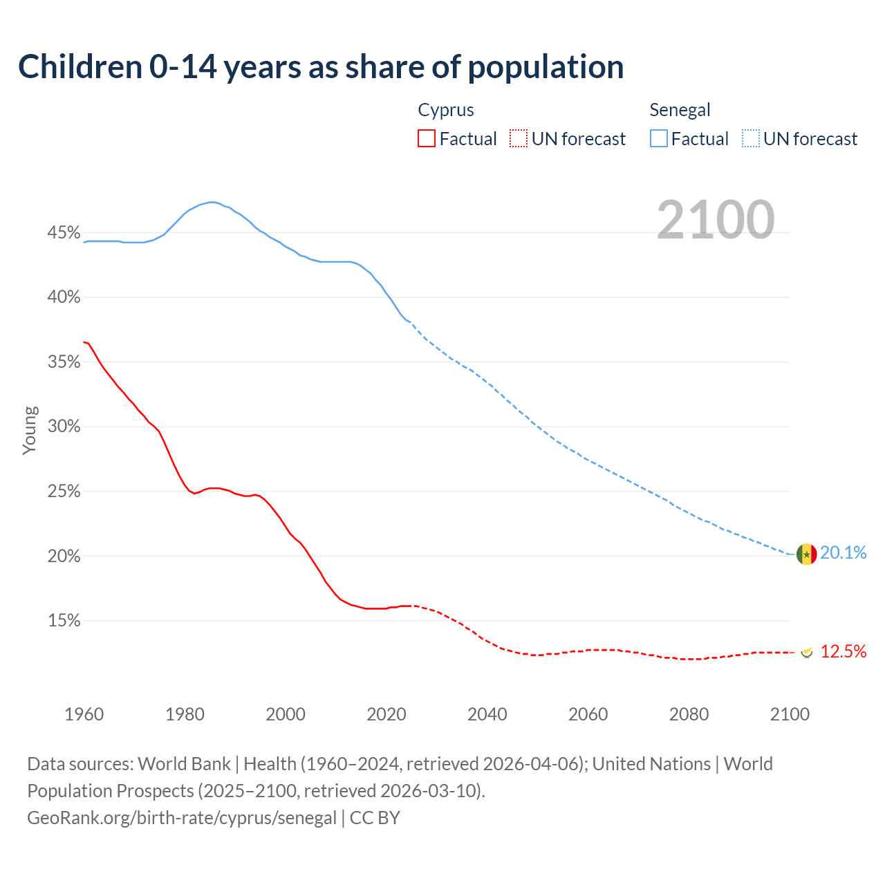 According to the latest available data on birth rates, the fertility rate in Cyprus was 1.39 children per woman in 2023, compared to 3.82 in Senegal in 2023. The replacement level is considered to be 2.1 children per woman.