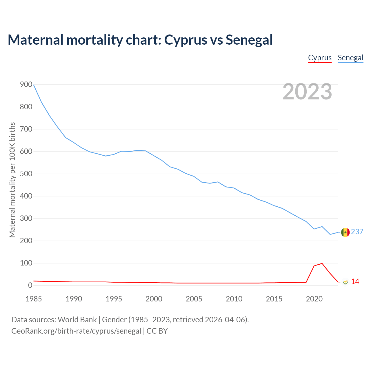 The maternal mortality rate, which is the probability of dying during childbirth or within 42 days of pregnancy termination, is 14 deaths per 100,000 live births in Cyprus, compared to 237 deaths in Senegal.