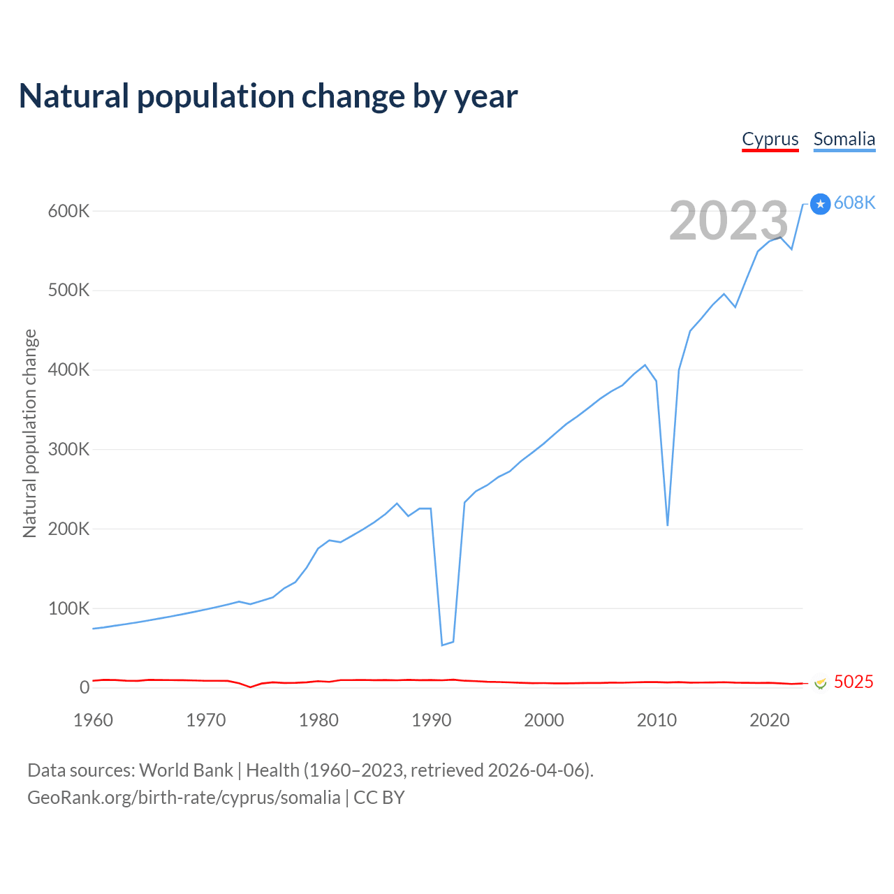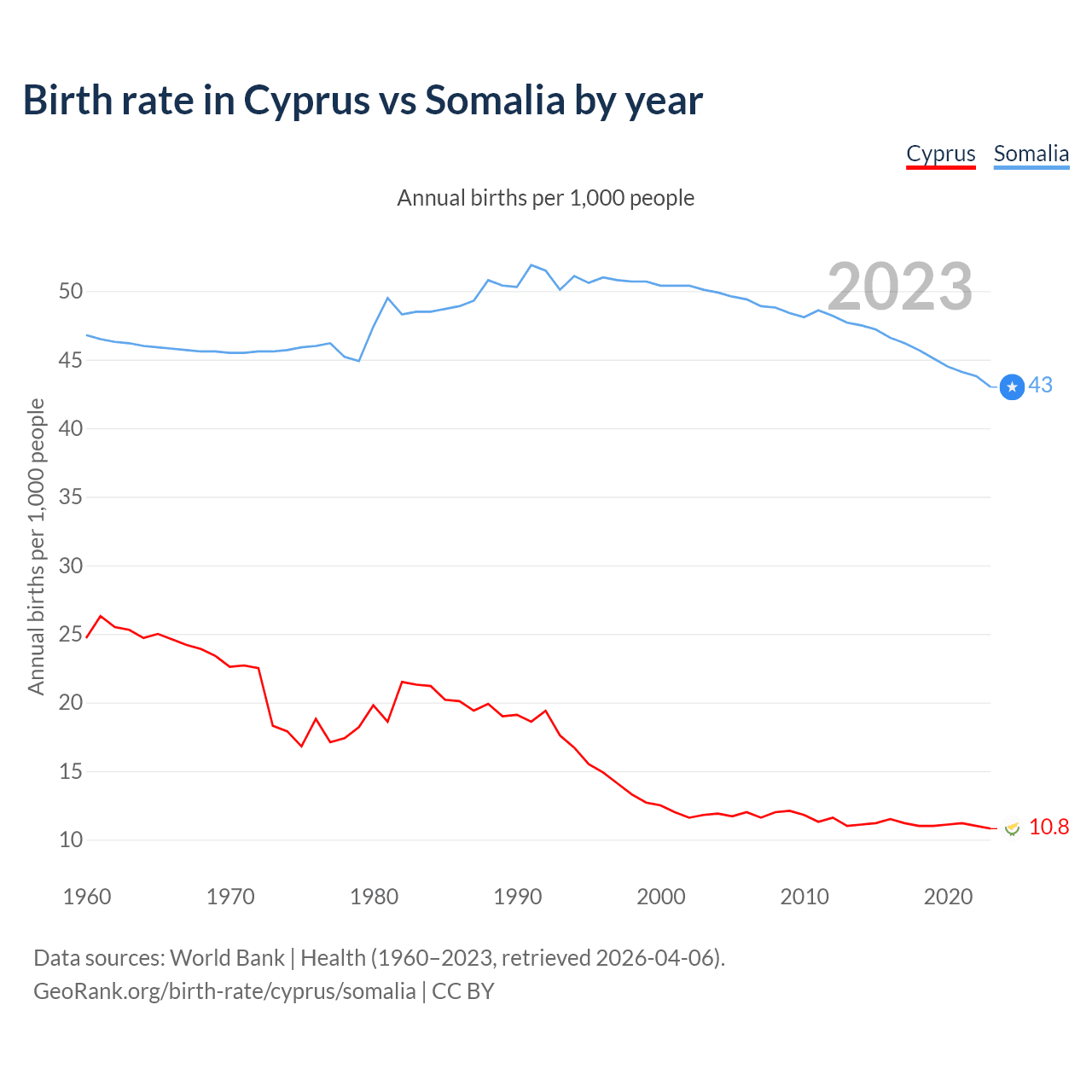 Cyprus has an annual birth rate of 10.8 births per 1,000 people, compared to 43 for Somalia. The average number of children a woman is expected to have during her lifetime — the fertility rate, is 1.39 in Cyprus and 6.13 in Somalia — 341% difference.