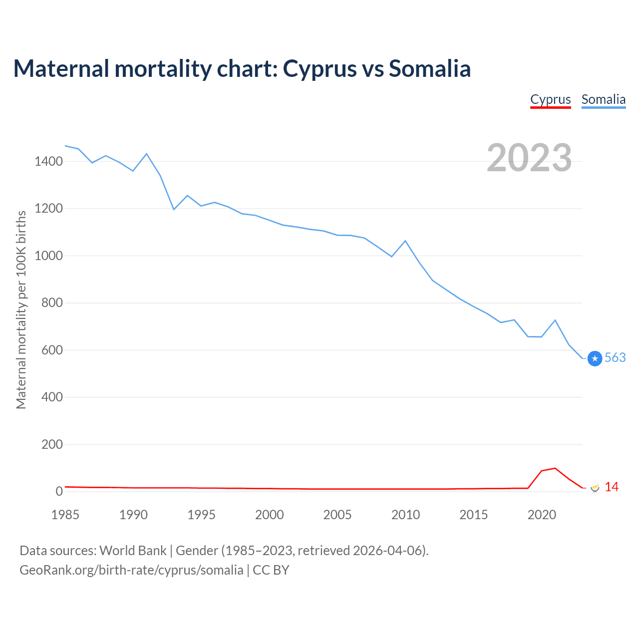 The maternal mortality rate, which is the probability of dying during childbirth or within 42 days of pregnancy termination, is 14 deaths per 100,000 live births in Cyprus, compared to 563 deaths in Somalia.