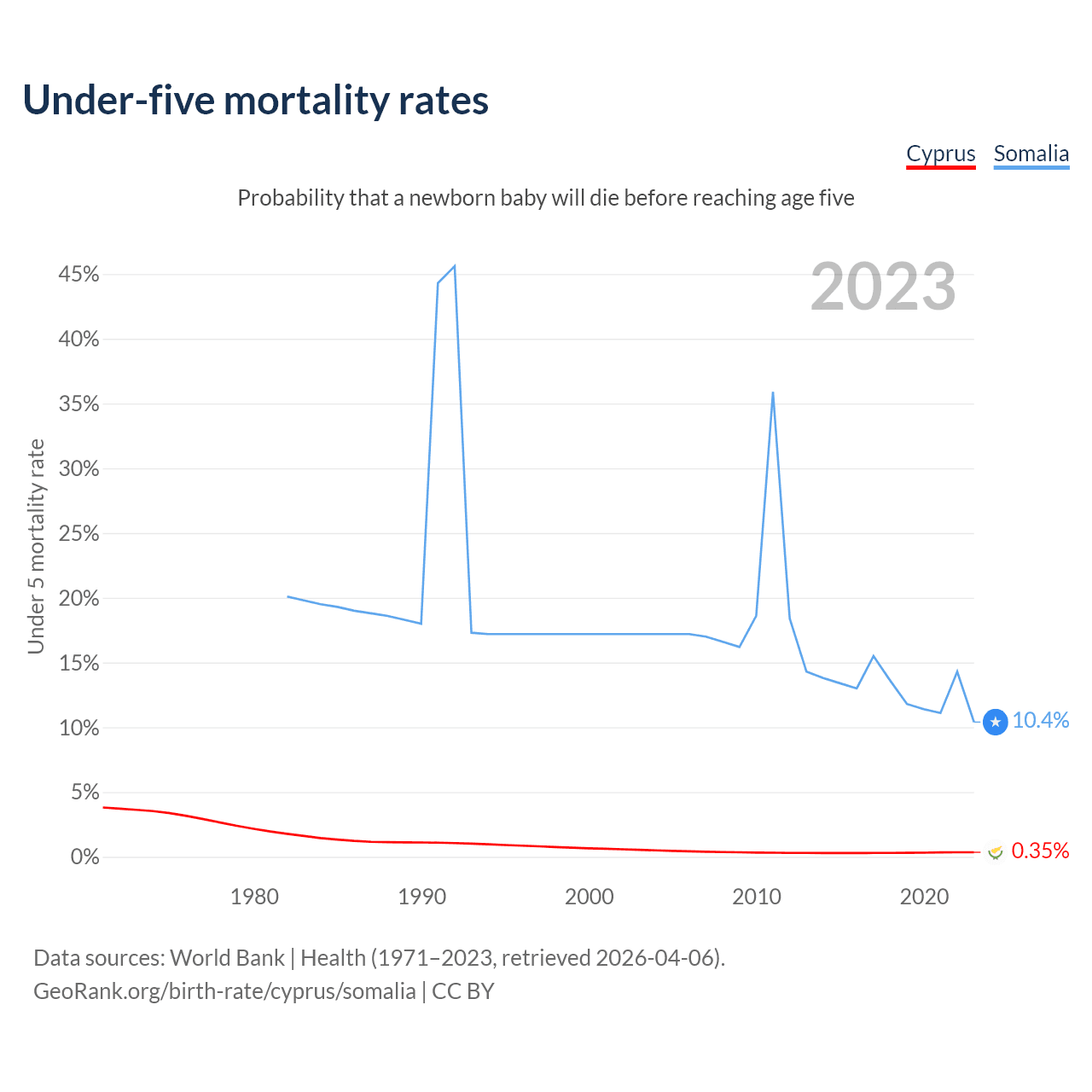 The chance that a newborn baby will die before reaching age five is 0.35% in Cyprus and 10.4% in Somalia. Above is a chart with historical data on under-five mortality rates.