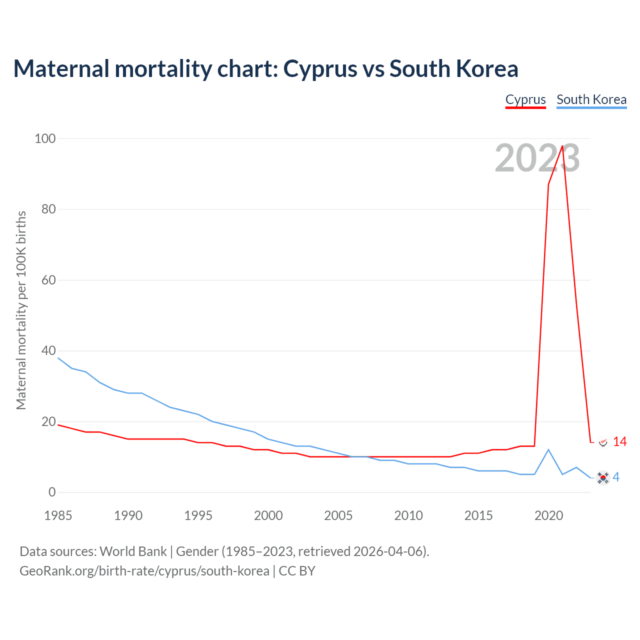 The maternal mortality rate, which is the probability of dying during childbirth or within 42 days of pregnancy termination, is 14 deaths per 100,000 live births in Cyprus, compared to 4 deaths in South Korea.