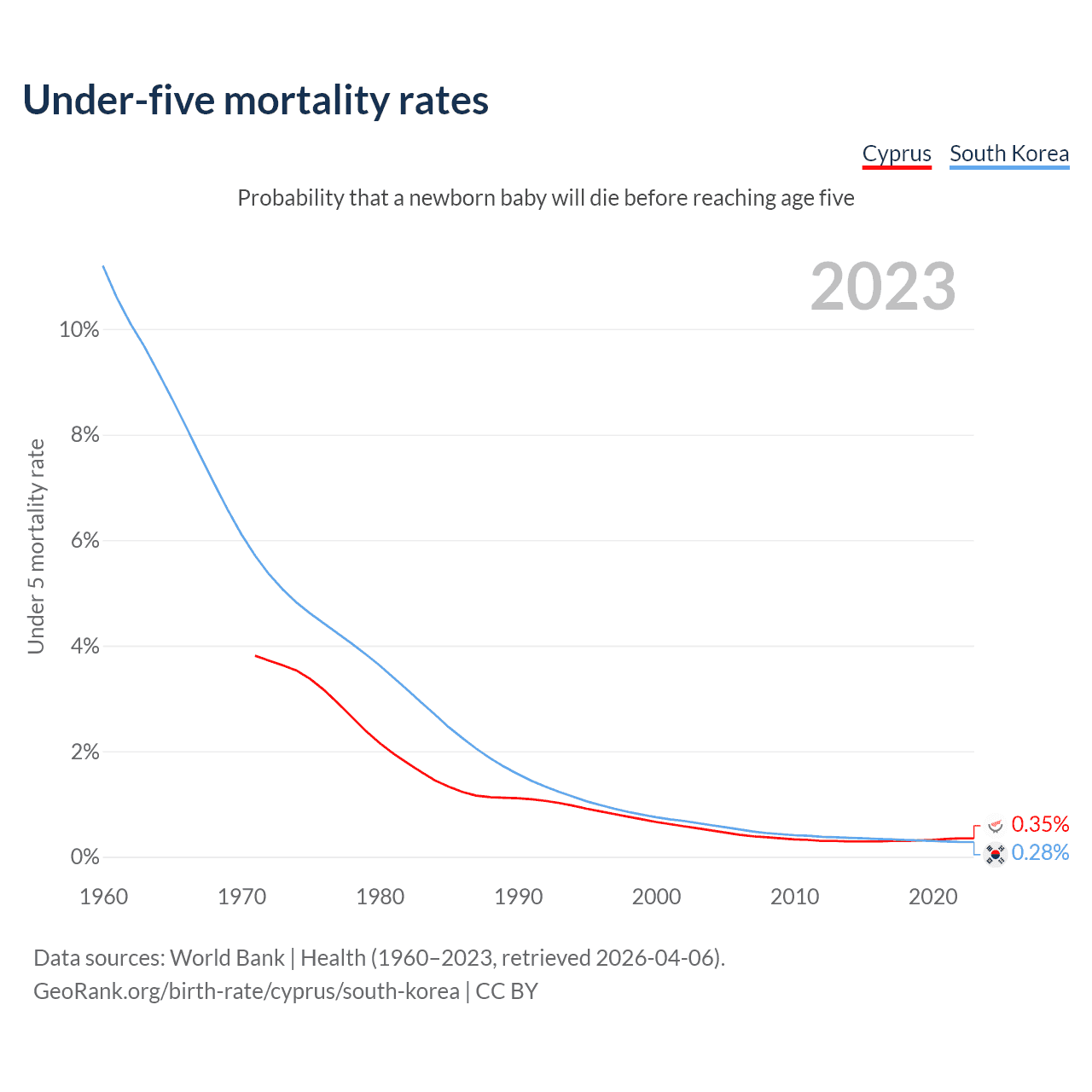 The chance that a newborn baby will die before reaching age five is 0.35% in Cyprus and 0.28% in South Korea. Above is a chart with historical data on under-five mortality rates.