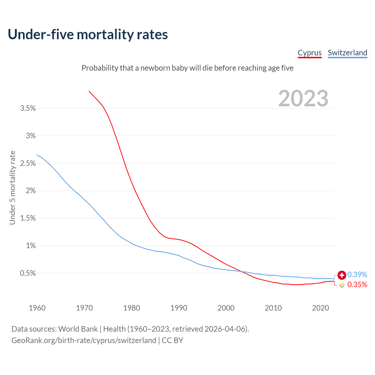 The chance that a newborn baby will die before reaching age five is 0.35% in Cyprus and 0.39% in Switzerland. Above is a chart with historical data on under-five mortality rates.