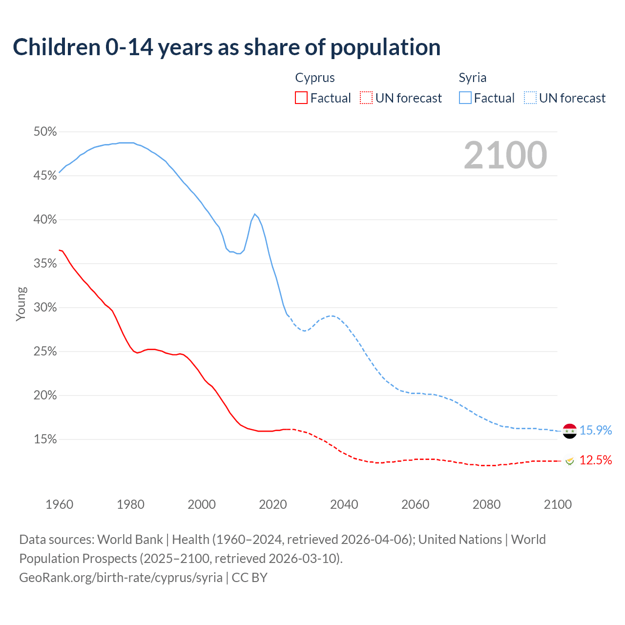 Cyprus has an annual birth rate of 10.8 births per 1,000 people, compared to 22.1 for Syria. The average number of children a woman is expected to have during her lifetime — the fertility rate, is 1.39 in Cyprus and 2.71 in Syria — 95.2% difference.