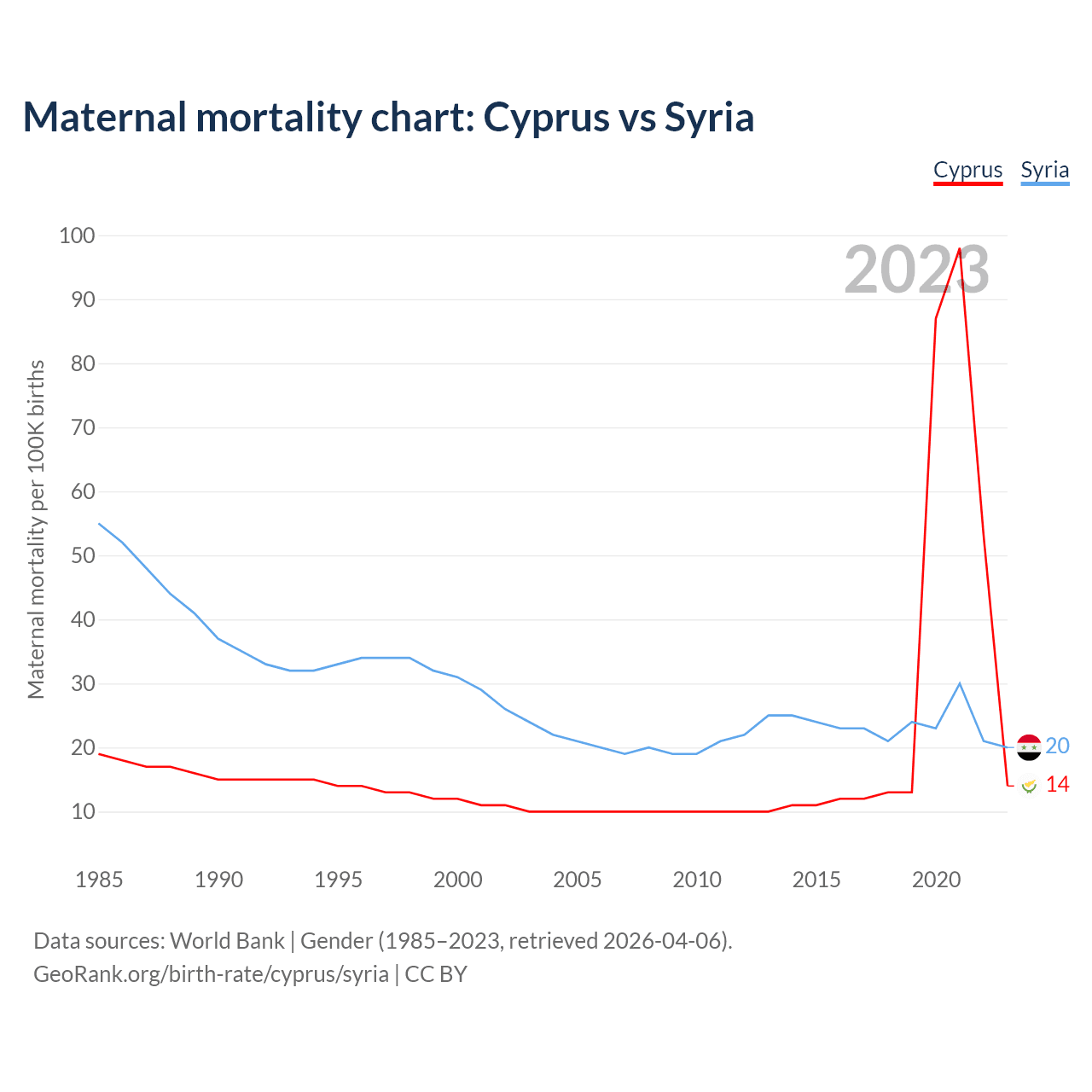 The maternal mortality rate, which is the probability of dying during childbirth or within 42 days of pregnancy termination, is 14 deaths per 100,000 live births in Cyprus, compared to 20 deaths in Syria.