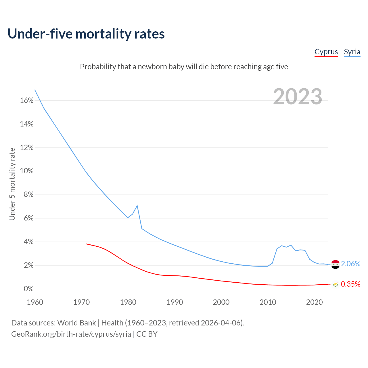 The chance that a newborn baby will die before reaching age five is 0.35% in Cyprus and 2.06% in Syria. Above is a chart with historical data on under-five mortality rates.