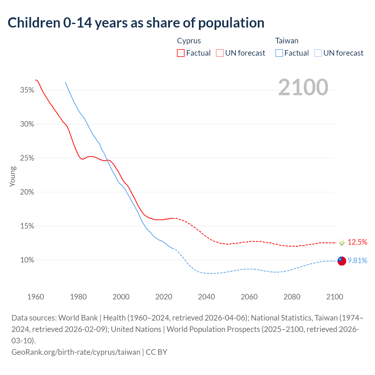 Cyprus has an annual birth rate of 10.8 births per 1,000 people, compared to 5.76 for Taiwan. The average number of children a woman is expected to have during her lifetime — the fertility rate, is 1.39 in Cyprus and 0.89 in Taiwan — 36.3% difference.