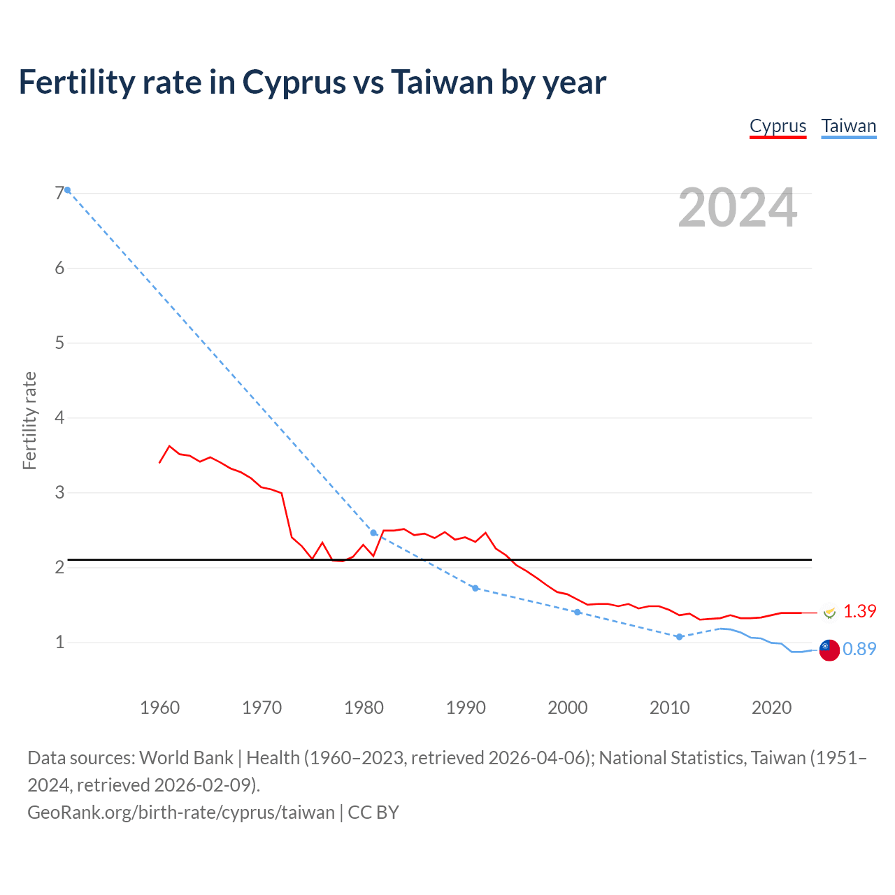 According to the latest available data on birth rates, the fertility rate in Cyprus was 1.39 children per woman in 2023, compared to 0.89 in Taiwan in 2024. The replacement level is considered to be 2.1 children per woman.