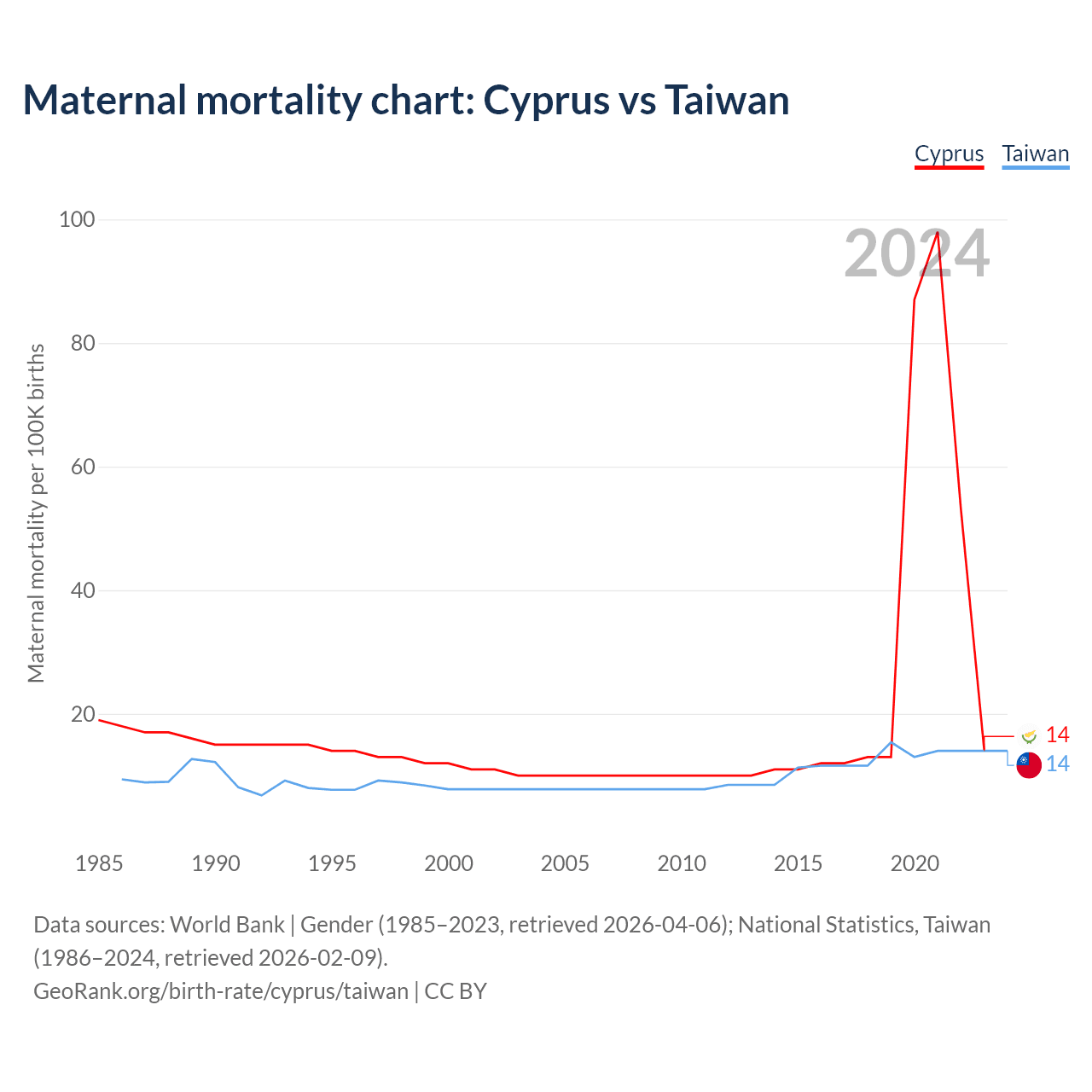 The maternal mortality rate, which is the probability of dying during childbirth or within 42 days of pregnancy termination, is 14 deaths per 100,000 live births in Cyprus, compared to 14 deaths in Taiwan.