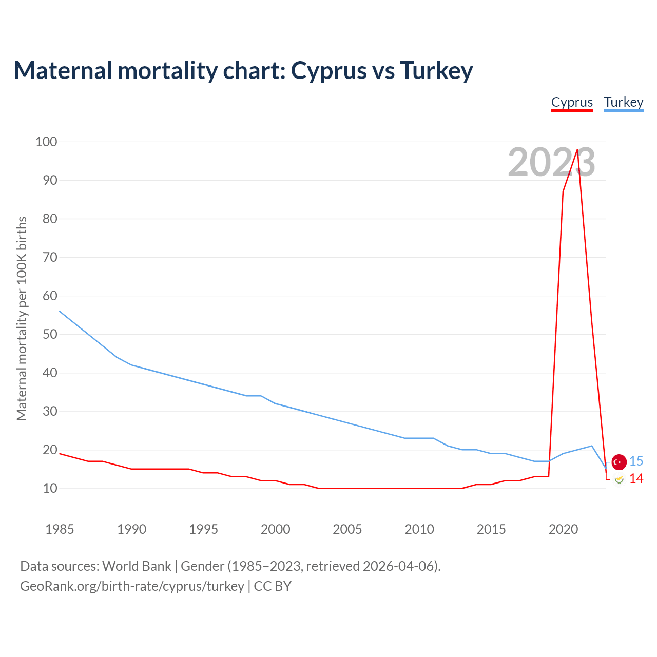 The maternal mortality rate, which is the probability of dying during childbirth or within 42 days of pregnancy termination, is 14 deaths per 100,000 live births in Cyprus, compared to 15 deaths in Turkey.