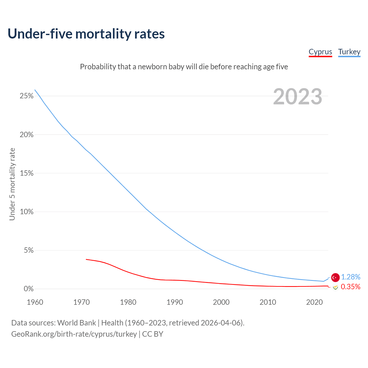 The chance that a newborn baby will die before reaching age five is 0.35% in Cyprus and 1.28% in Turkey. Above is a chart with historical data on under-five mortality rates.