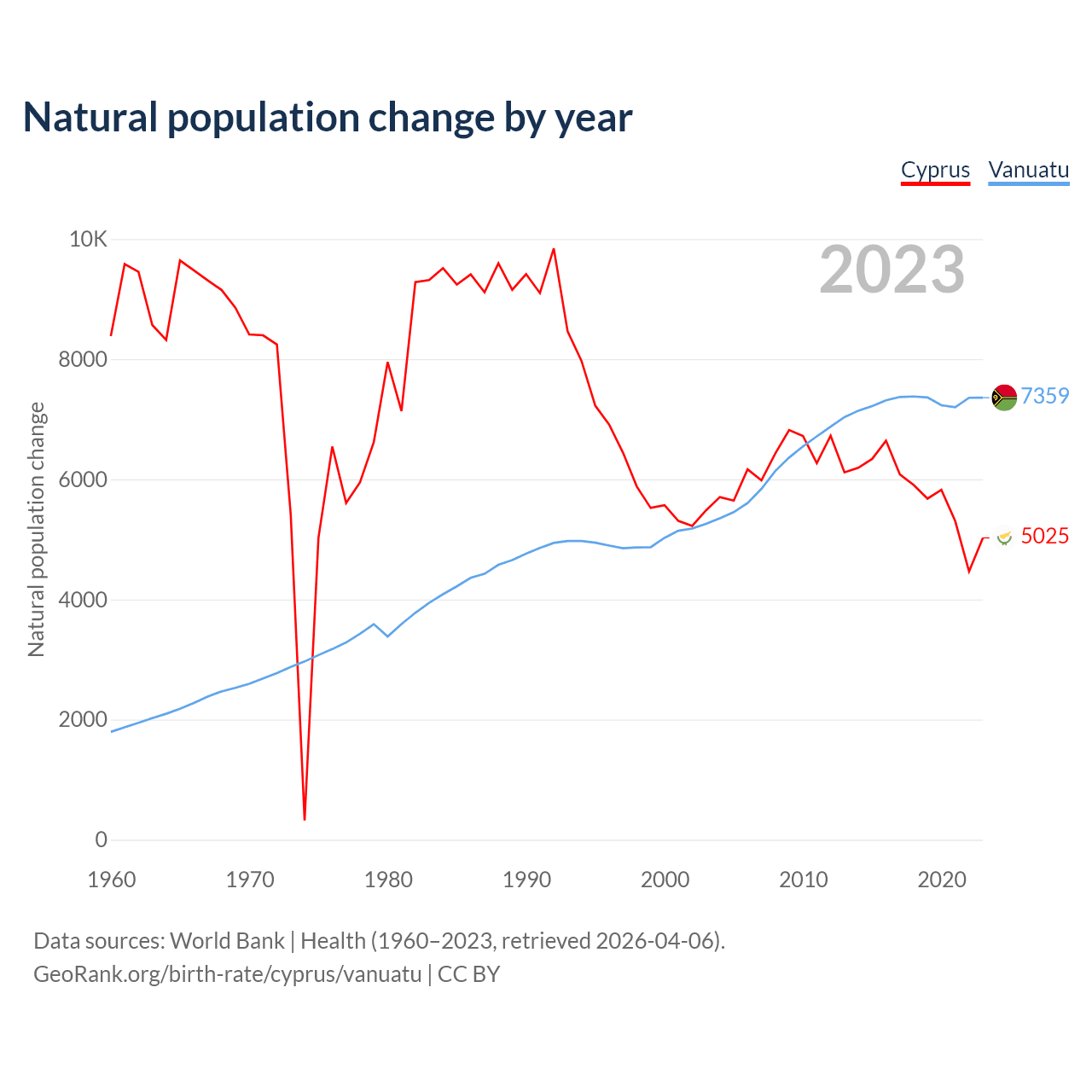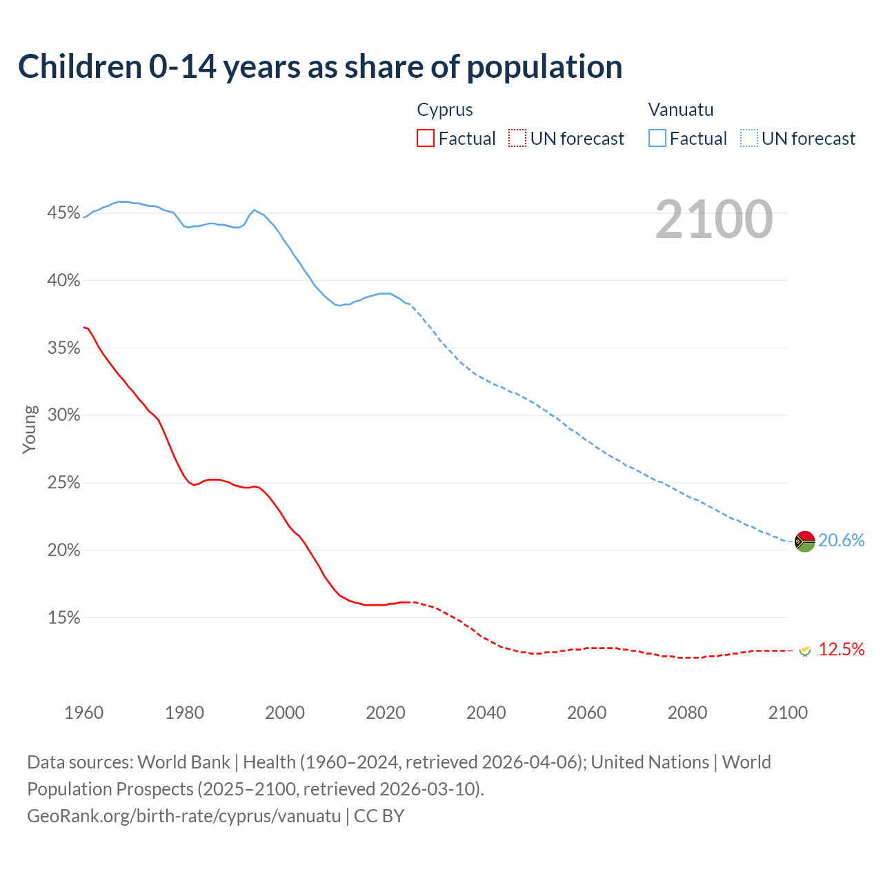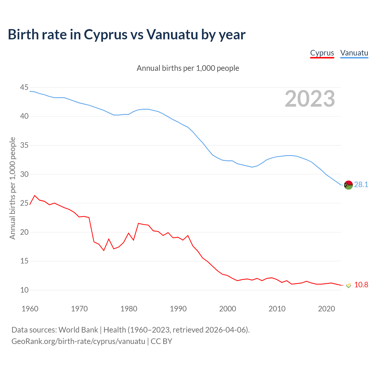 Cyprus has an annual birth rate of 10.8 births per 1,000 people, compared to 28.1 for Vanuatu. The average number of children a woman is expected to have during her lifetime — the fertility rate, is 1.39 in Cyprus and 3.6 in Vanuatu — 158.9% difference.