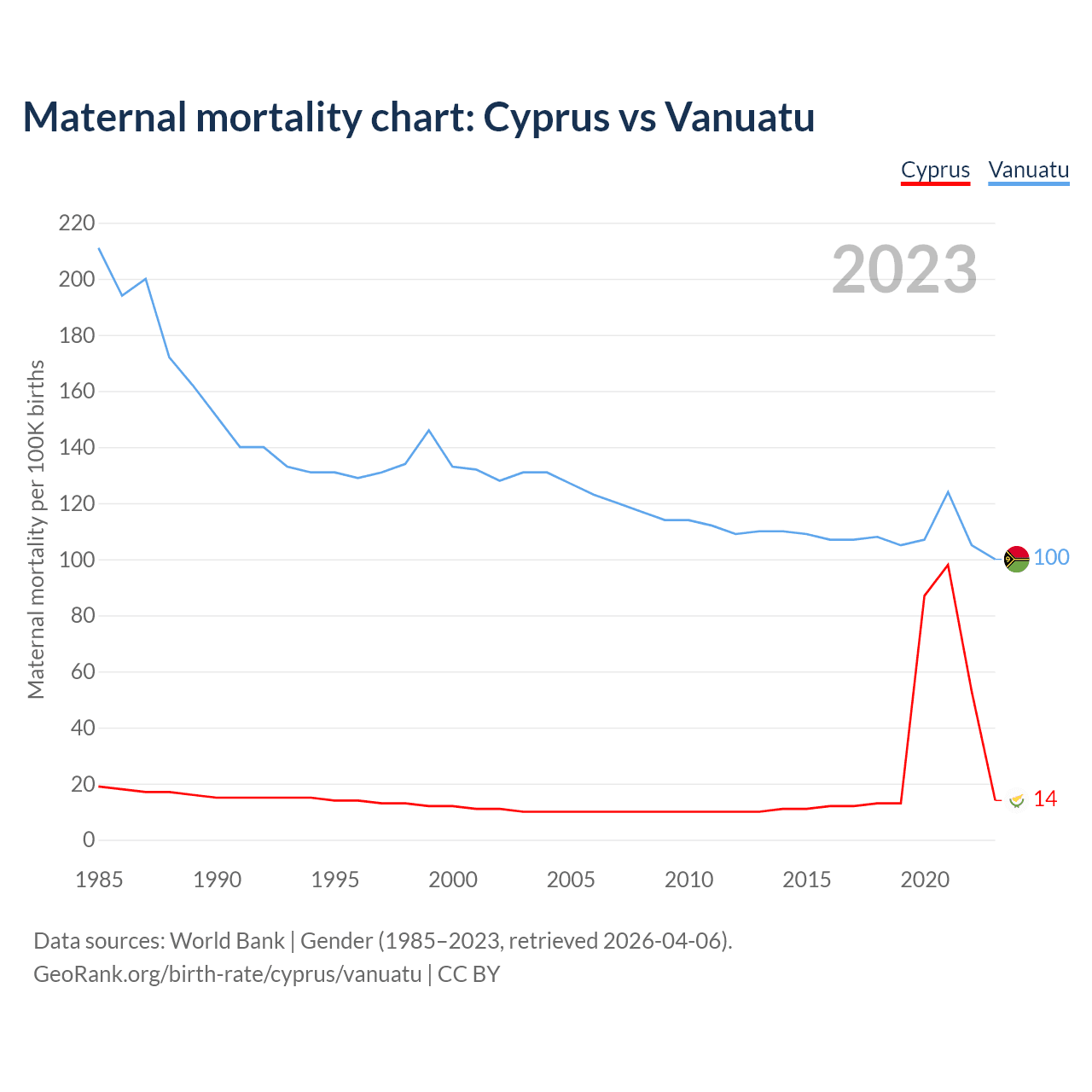 The maternal mortality rate, which is the probability of dying during childbirth or within 42 days of pregnancy termination, is 14 deaths per 100,000 live births in Cyprus, compared to 100 deaths in Vanuatu.