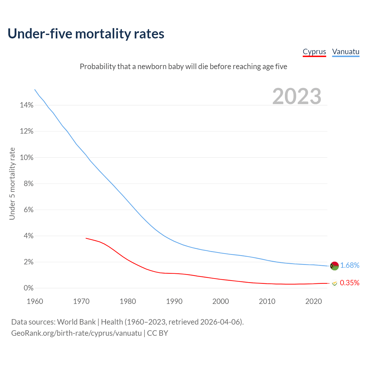 The chance that a newborn baby will die before reaching age five is 0.35% in Cyprus and 1.68% in Vanuatu. Above is a chart with historical data on under-five mortality rates.