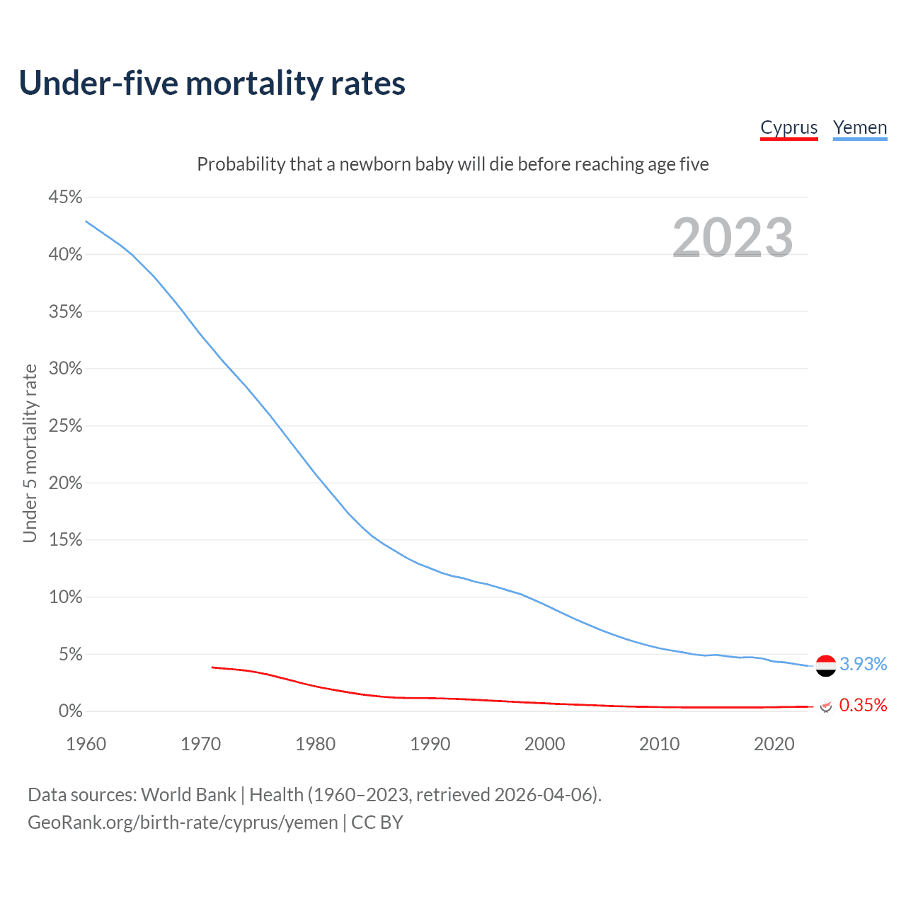 The chance that a newborn baby will die before reaching age five is 0.35% in Cyprus and 3.93% in Yemen. Above is a chart with historical data on under-five mortality rates.