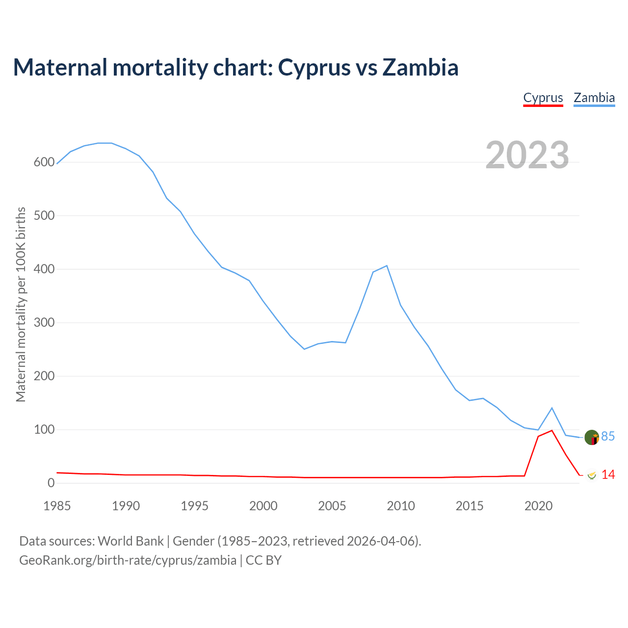 The maternal mortality rate, which is the probability of dying during childbirth or within 42 days of pregnancy termination, is 14 deaths per 100,000 live births in Cyprus, compared to 85 deaths in Zambia.