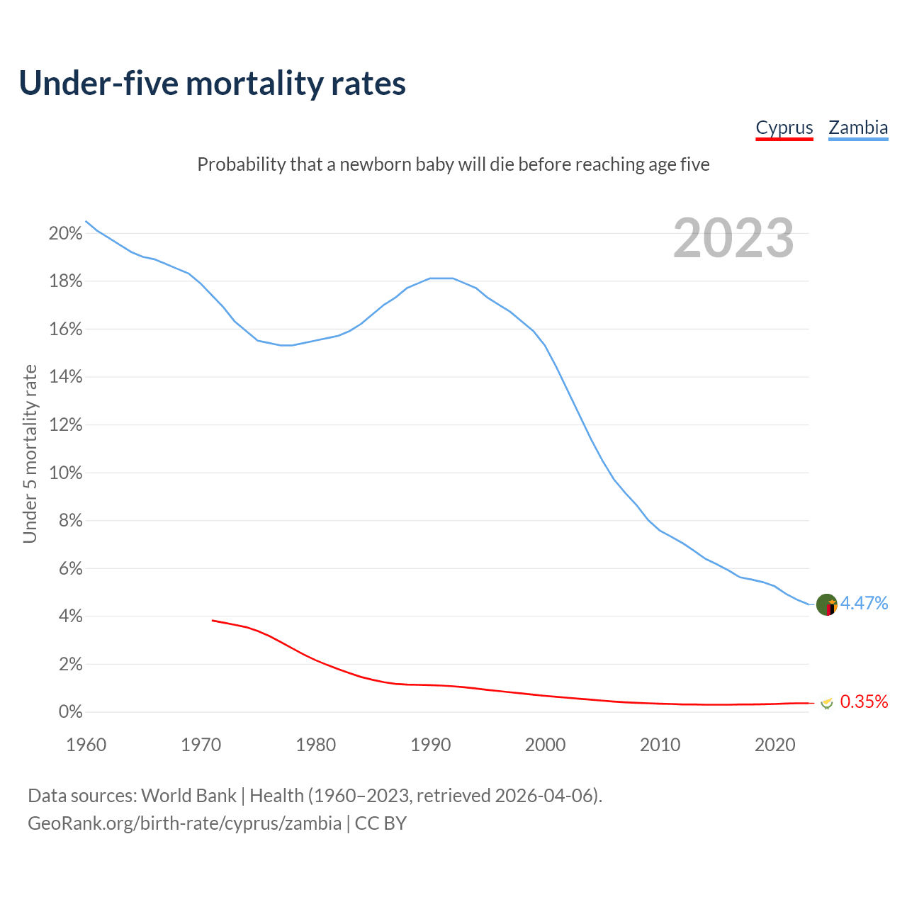 The chance that a newborn baby will die before reaching age five is 0.35% in Cyprus and 4.47% in Zambia. Above is a chart with historical data on under-five mortality rates.