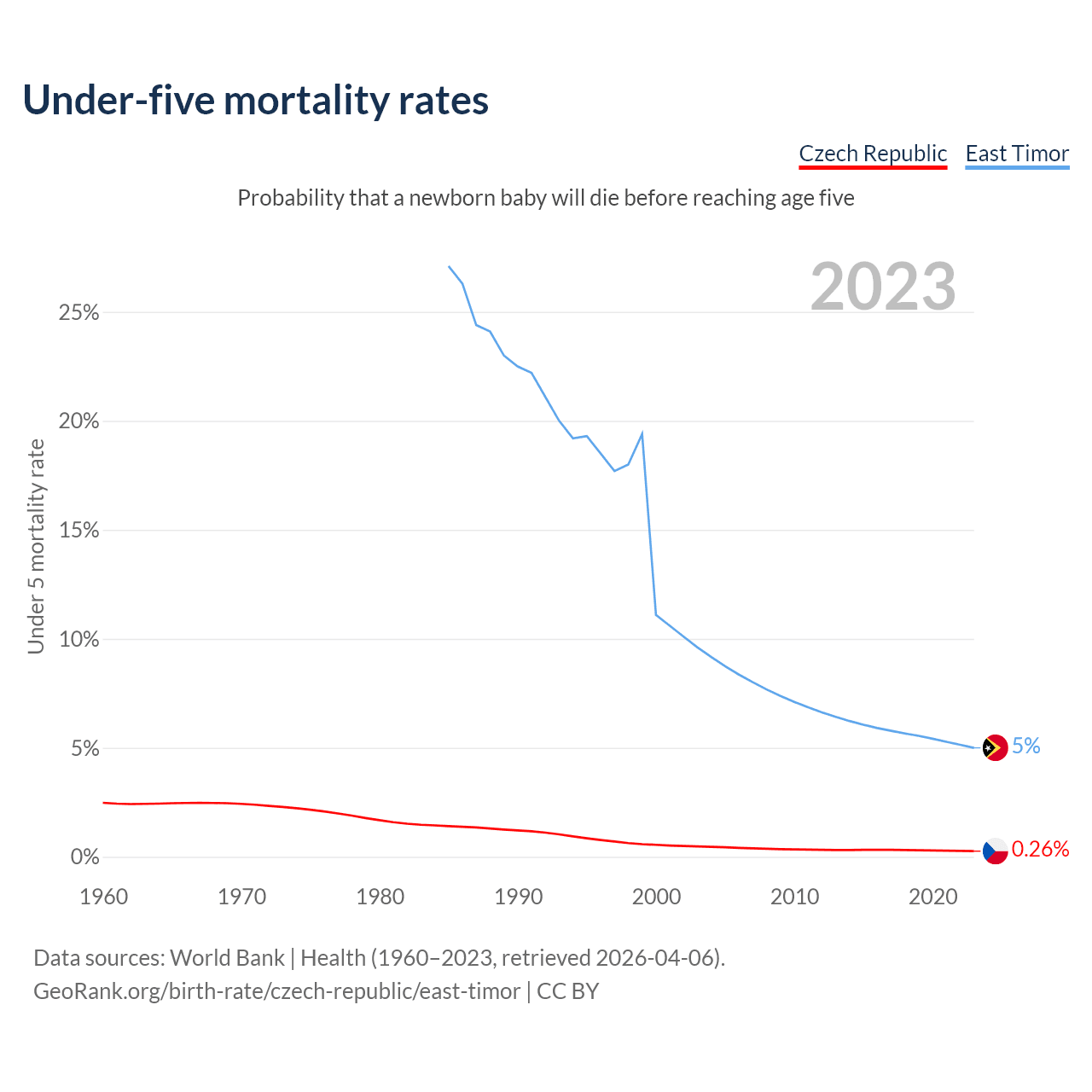 The chance that a newborn baby will die before reaching age five is 0.26% in the Czech Republic and 5% in East Timor. Above is a chart with historical data on under-five mortality rates.
