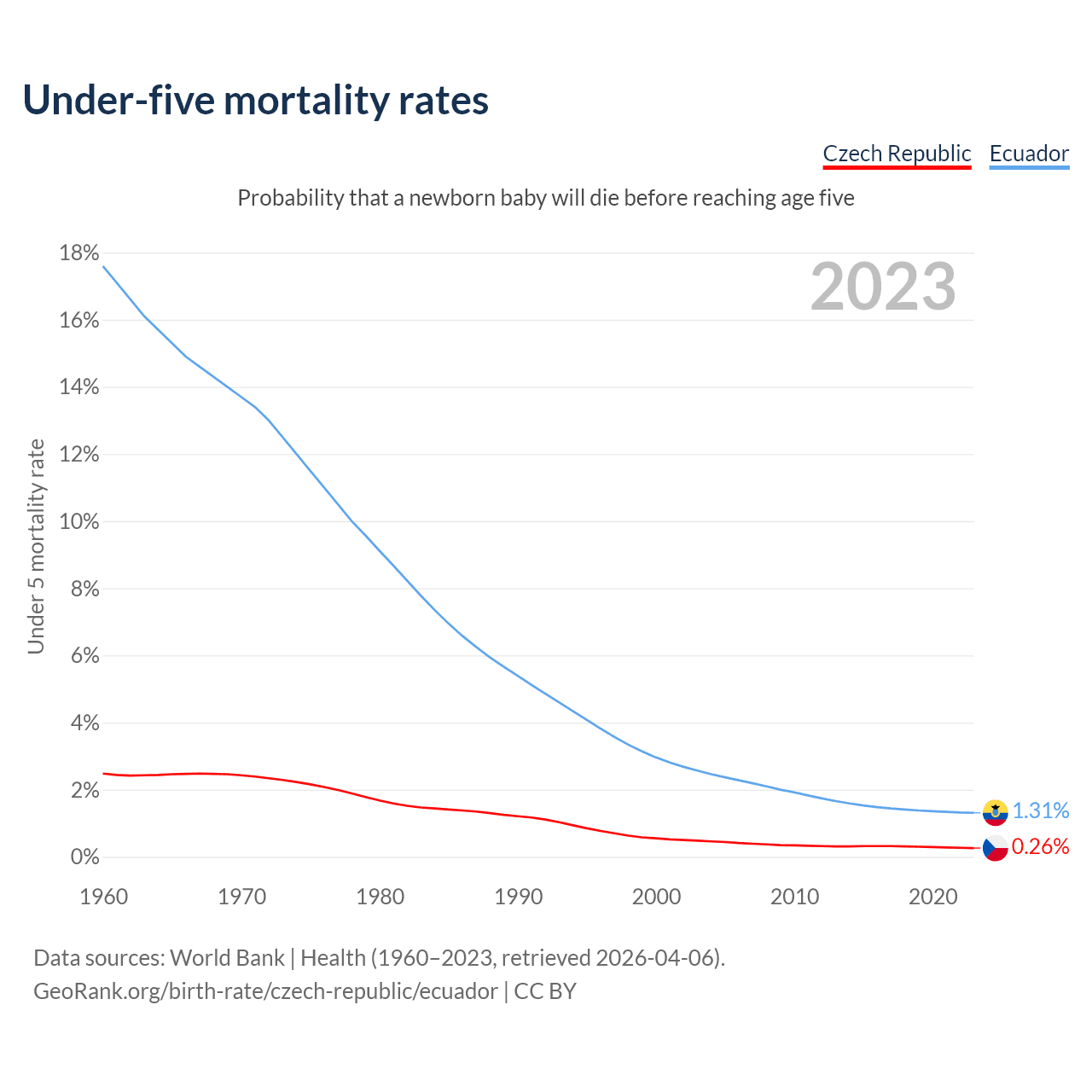 The chance that a newborn baby will die before reaching age five is 0.26% in the Czech Republic and 1.31% in Ecuador. Above is a chart with historical data on under-five mortality rates.