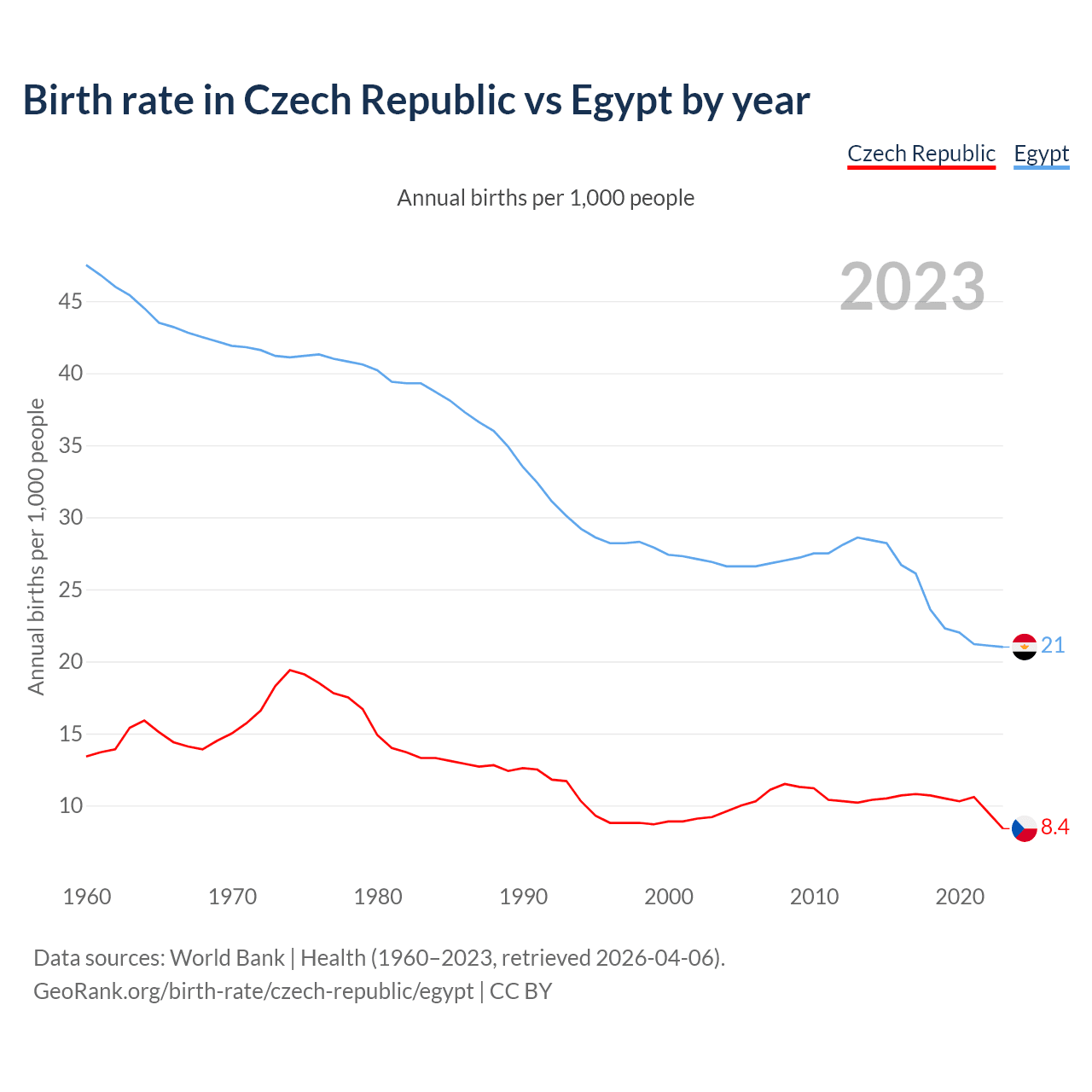 The Czech Republic has an annual birth rate of 8.4 births per 1,000 people, compared to 21 for Egypt. The average number of children a woman is expected to have during her lifetime — the fertility rate, is 1.45 in the Czech Republic and 2.75 in Egypt — 89.7% difference.