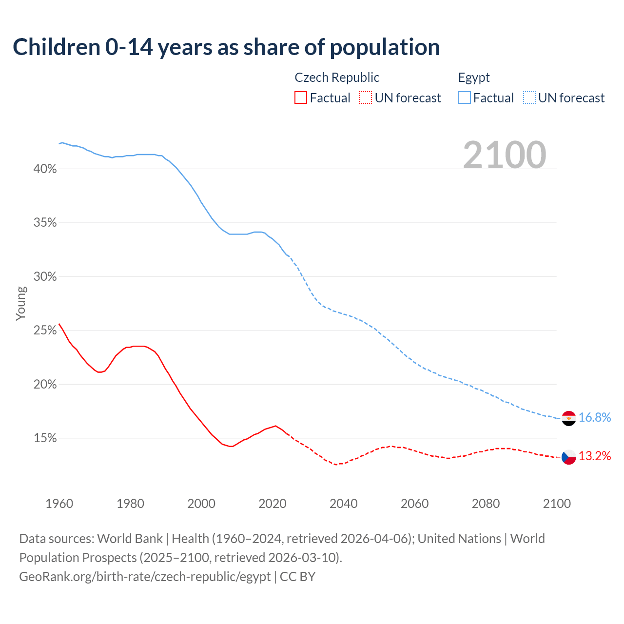 According to the latest available data on birth rates, the fertility rate in the Czech Republic was 1.45 children per woman in 2023, compared to 2.75 in Egypt in 2023. The replacement level is considered to be 2.1 children per woman.