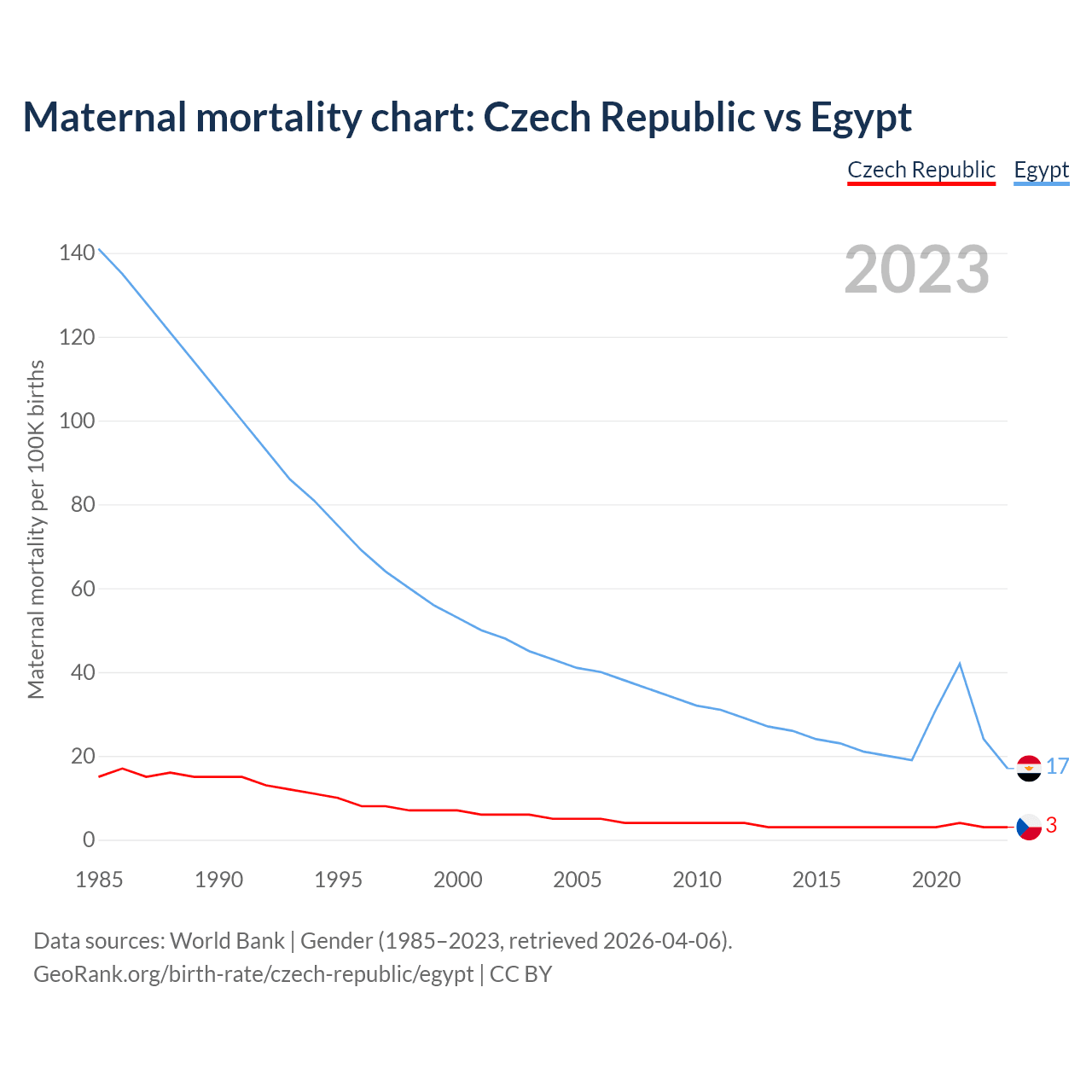 The maternal mortality rate, which is the probability of dying during childbirth or within 42 days of pregnancy termination, is 3 deaths per 100,000 live births in the Czech Republic, compared to 17 deaths in Egypt.