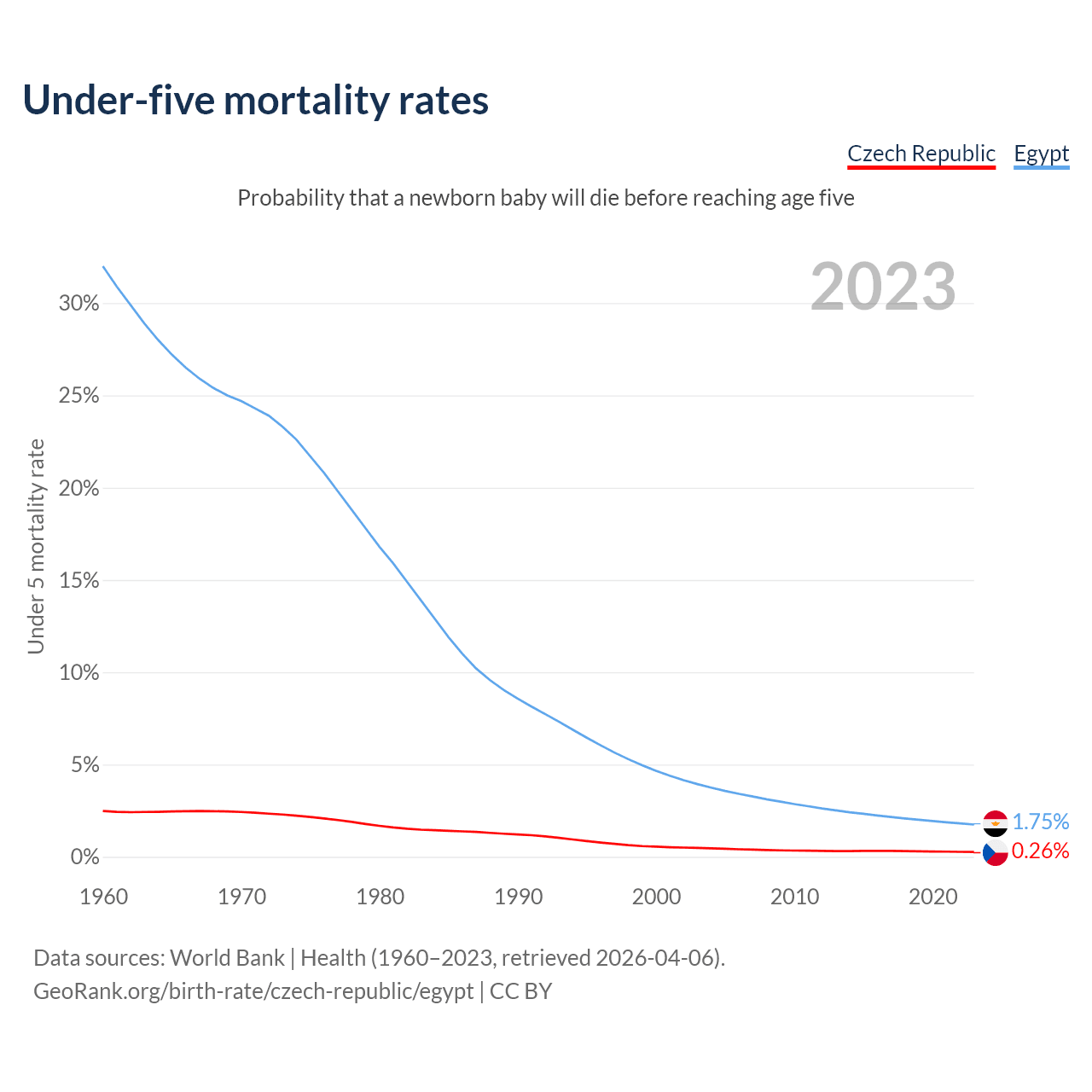 The chance that a newborn baby will die before reaching age five is 0.26% in the Czech Republic and 1.75% in Egypt. Above is a chart with historical data on under-five mortality rates.
