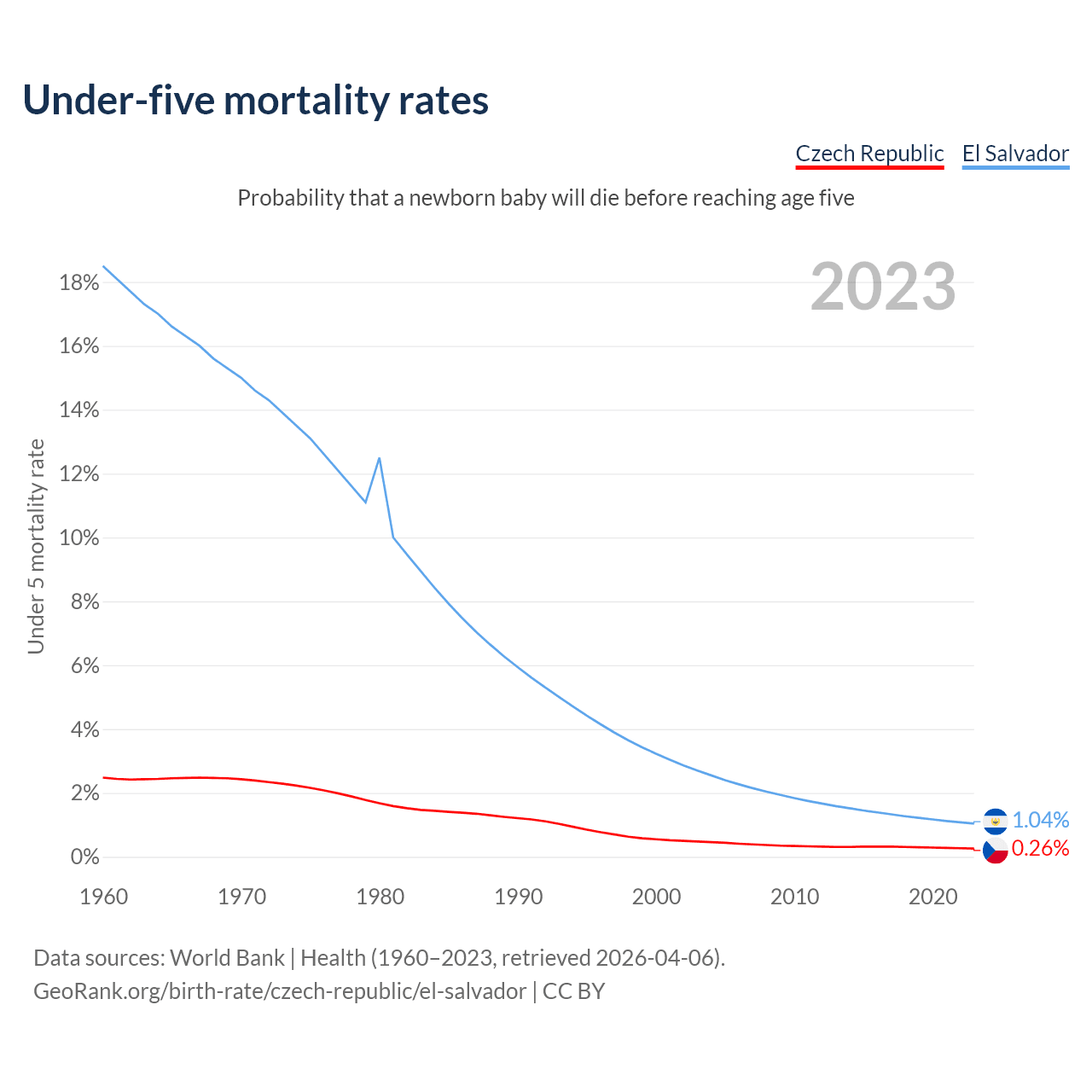 The chance that a newborn baby will die before reaching age five is 0.26% in the Czech Republic and 1.04% in El Salvador. Above is a chart with historical data on under-five mortality rates.