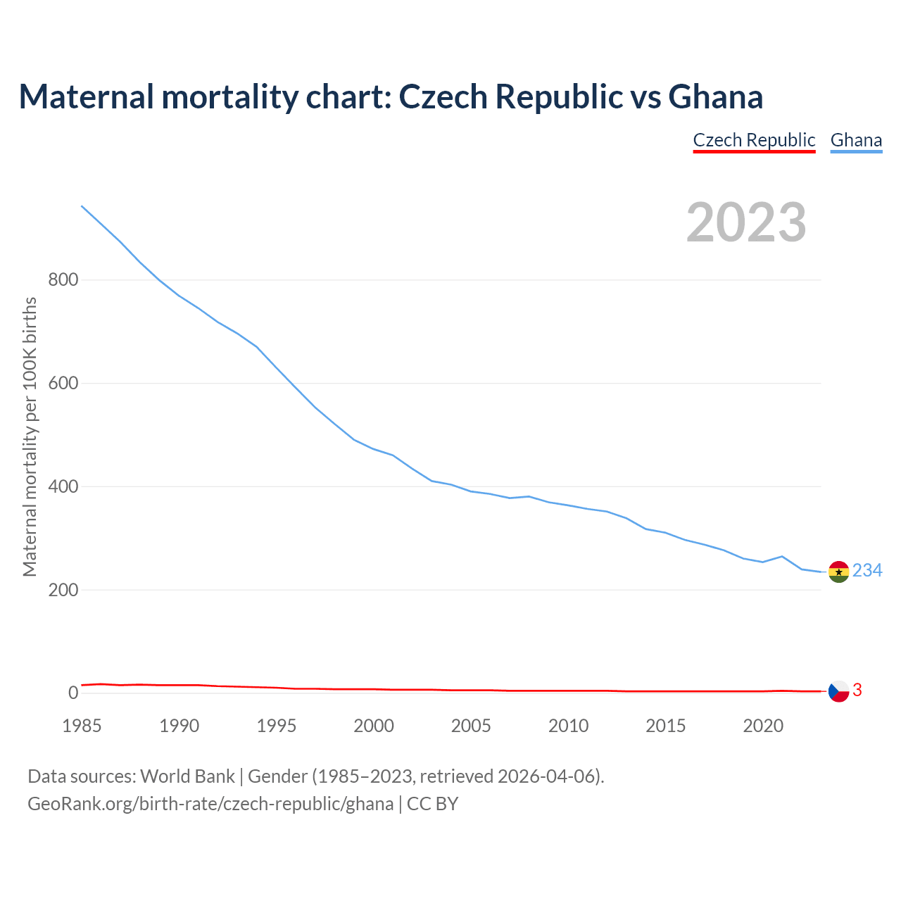 The maternal mortality rate, which is the probability of dying during childbirth or within 42 days of pregnancy termination, is 3 deaths per 100,000 live births in the Czech Republic, compared to 234 deaths in Ghana.