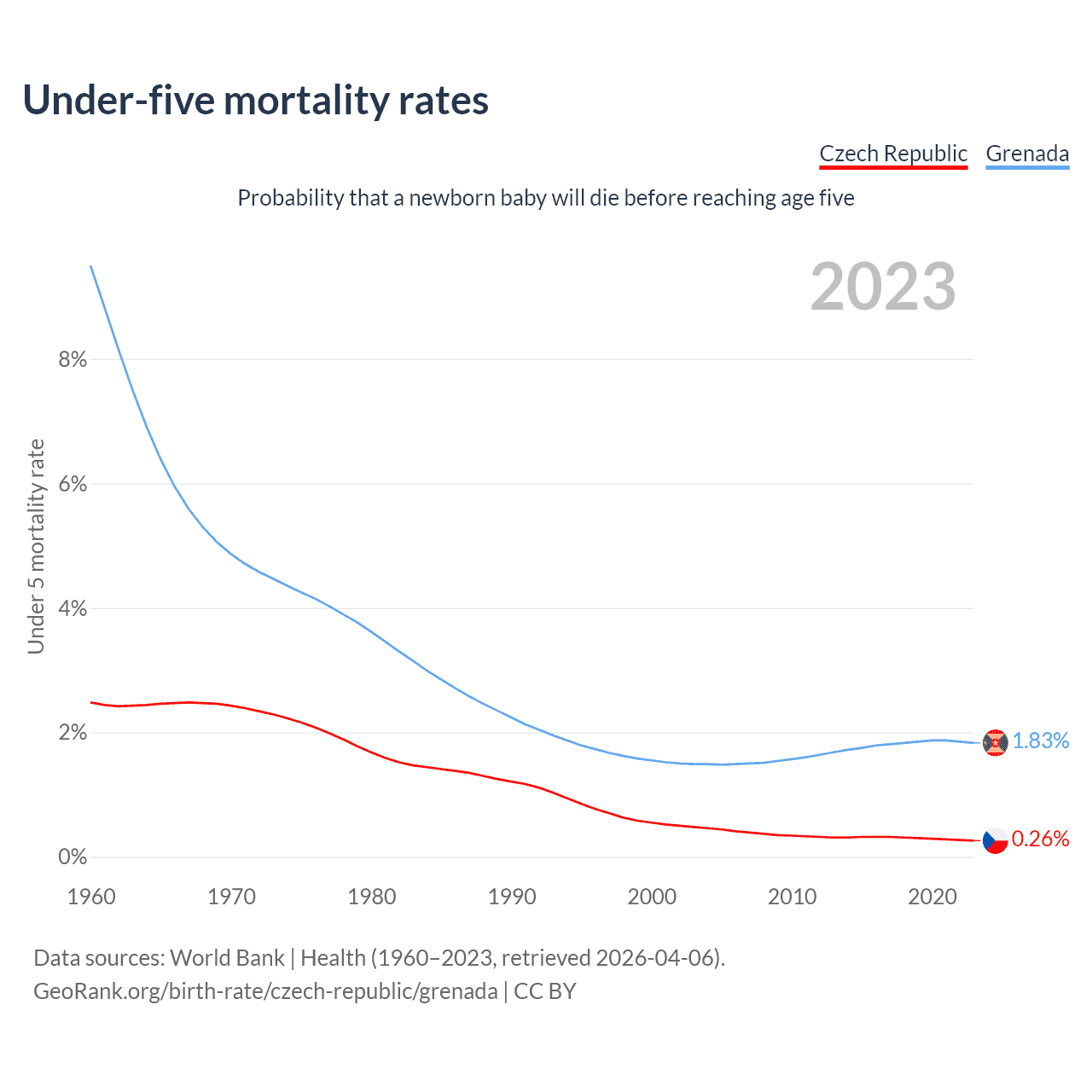 The chance that a newborn baby will die before reaching age five is 0.26% in the Czech Republic and 1.83% in Grenada. Above is a chart with historical data on under-five mortality rates.