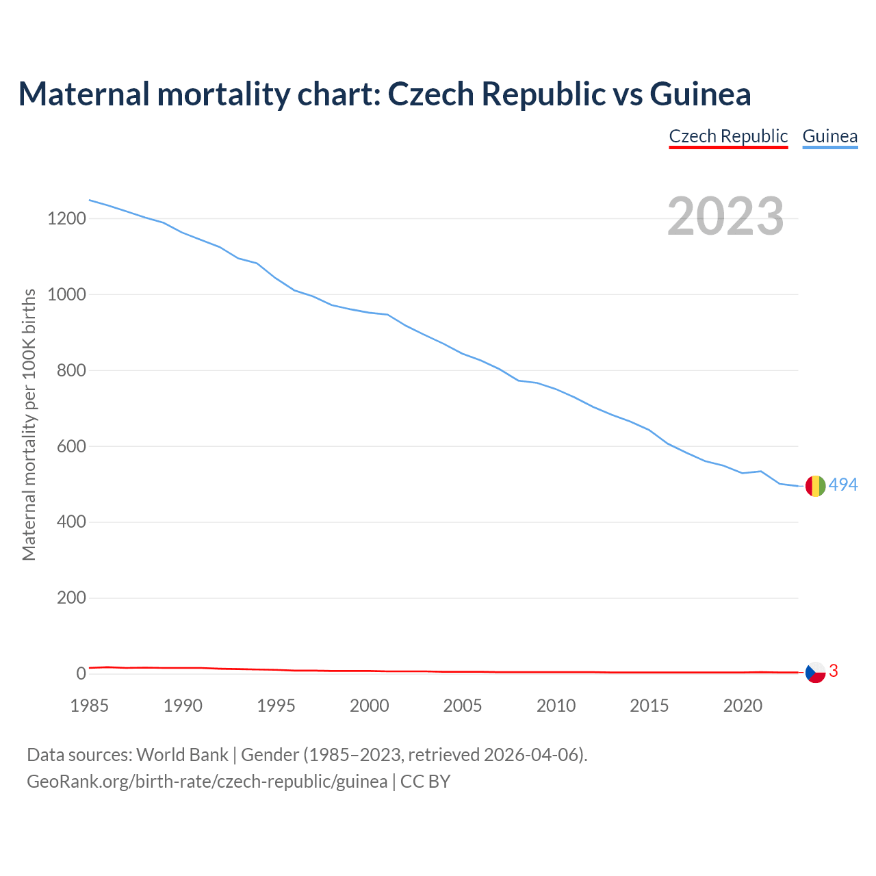 The maternal mortality rate, which is the probability of dying during childbirth or within 42 days of pregnancy termination, is 3 deaths per 100,000 live births in the Czech Republic, compared to 494 deaths in Guinea.