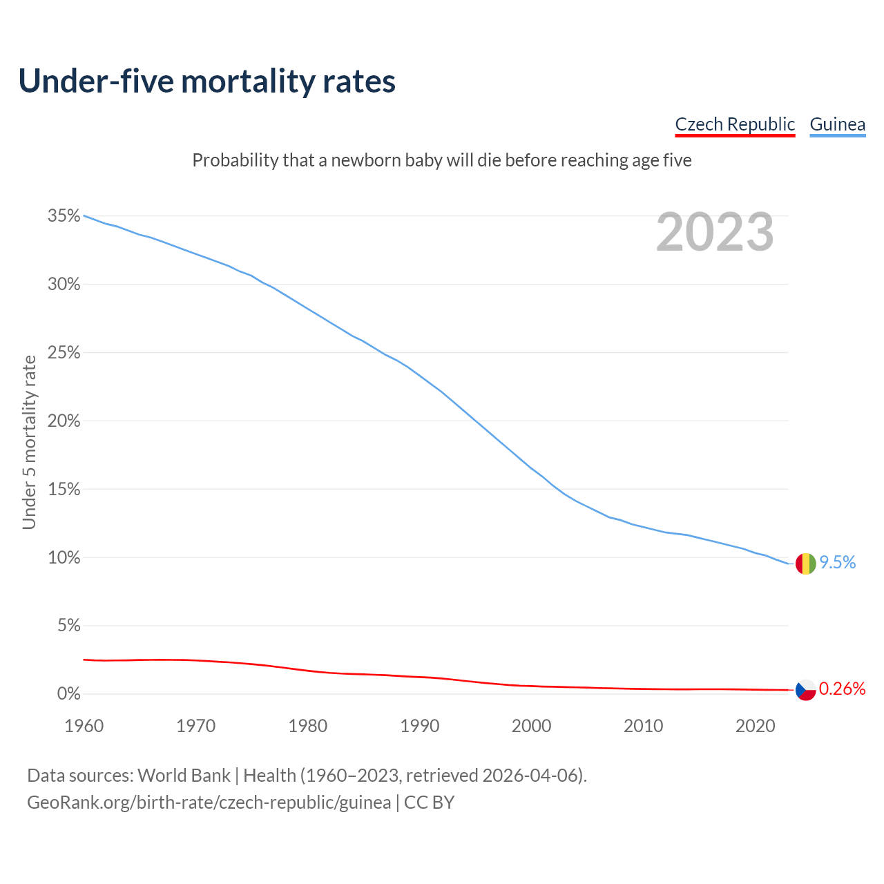 The chance that a newborn baby will die before reaching age five is 0.26% in the Czech Republic and 9.5% in Guinea. Above is a chart with historical data on under-five mortality rates.