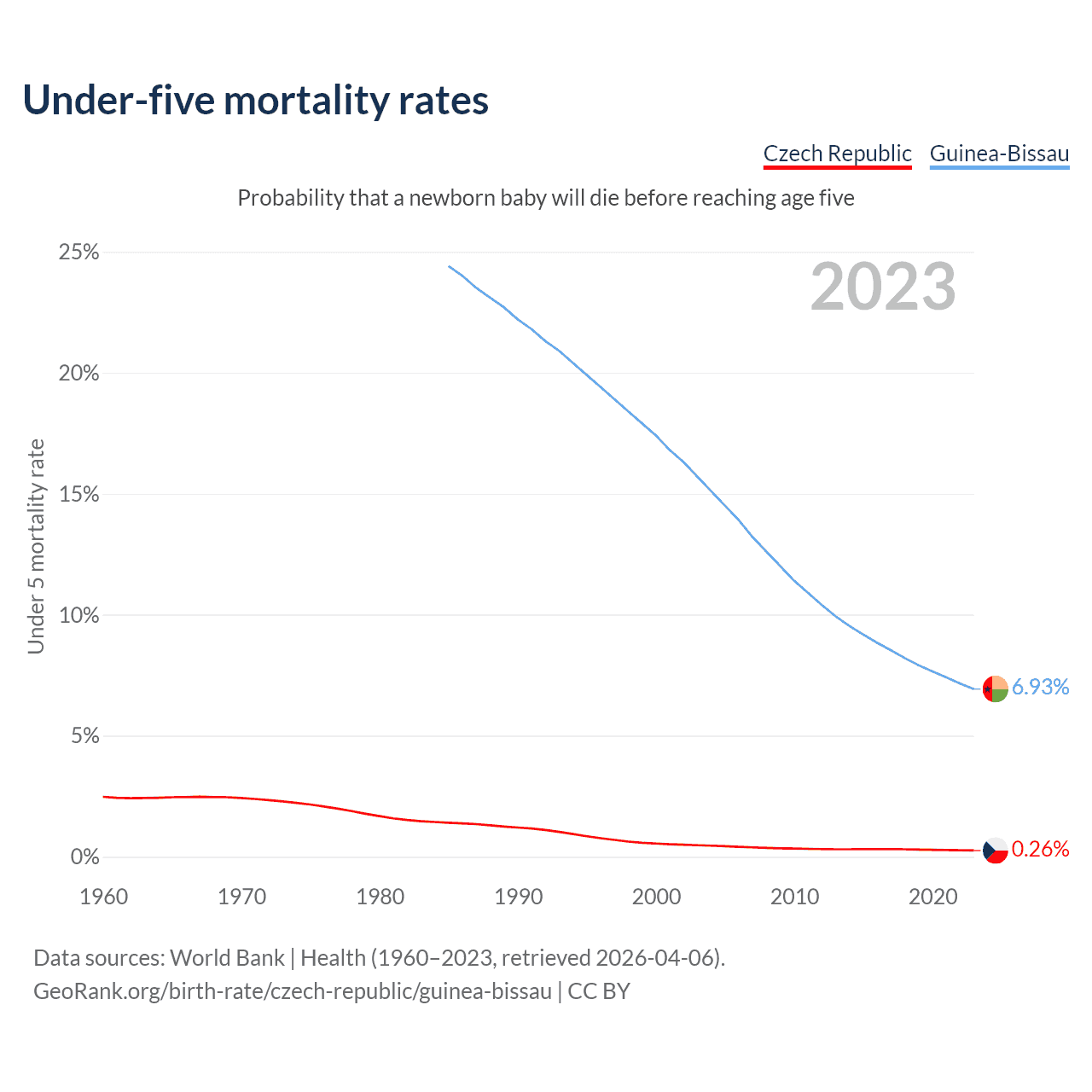 The chance that a newborn baby will die before reaching age five is 0.26% in the Czech Republic and 6.93% in Guinea-Bissau. Above is a chart with historical data on under-five mortality rates.